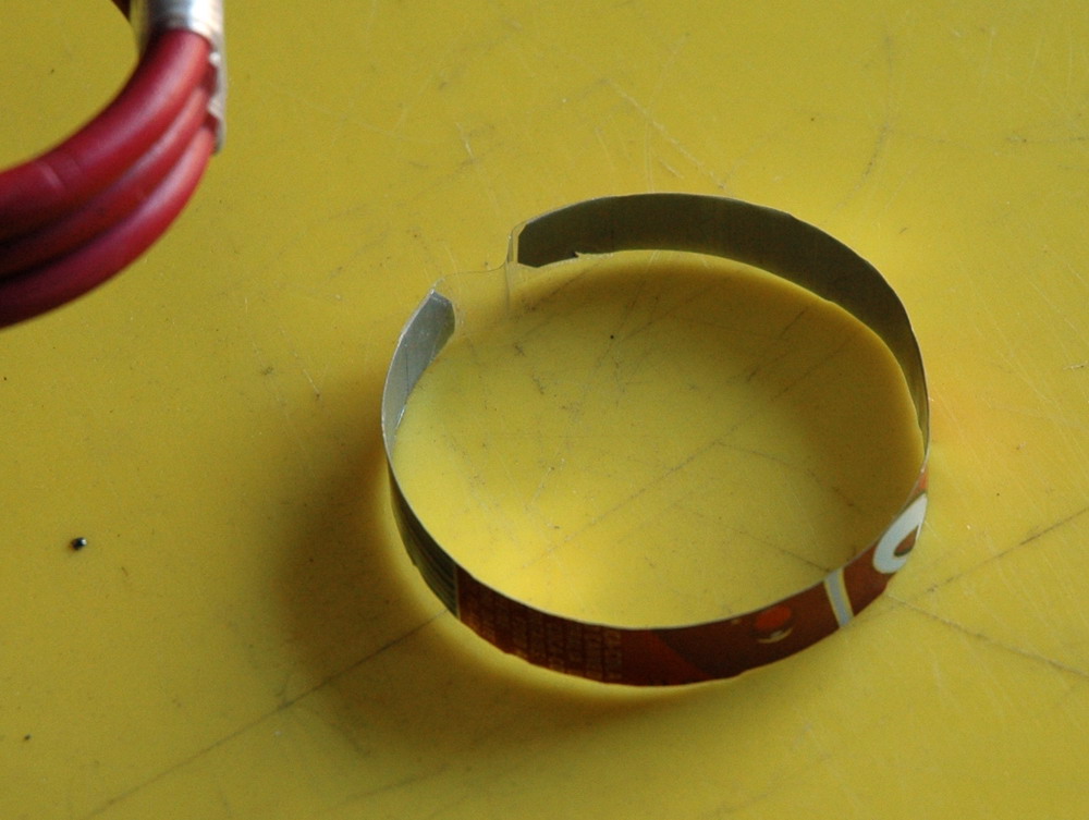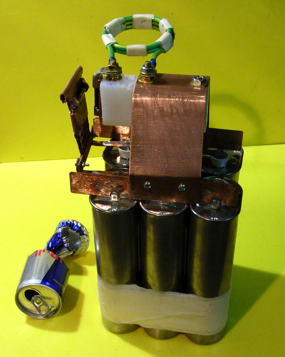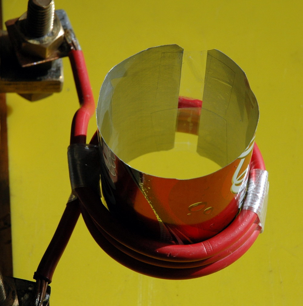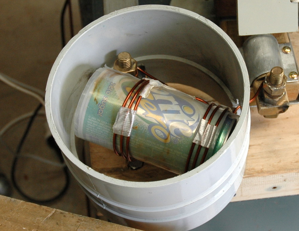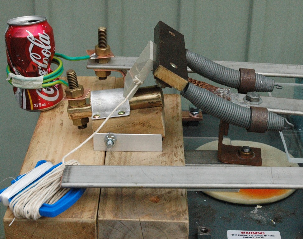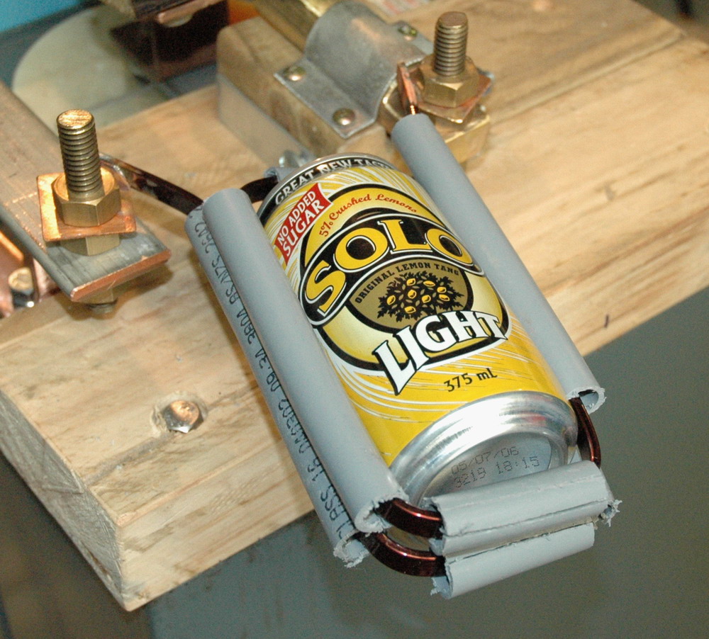 years later in October 2007 so it has been durable and reliable. Left photo shows the a can crushed and torn apart at 4 kJ. The right photo shows the coil distortion from a similar power shot. Since the peak can current is around 2 times that of the coil current (see below), then a 70 kA coil current suggests a peak can current of 140 kA. Left photo shows a frozen can fired at 2 kJ. Note the folding and wrinkling and apparent area of missing can. The centre and right photos show similar shots. Left photo shows a can in a longitudinal coil about to be fired at 4 kJ. The right photo shows the result. What will happen here with a split can (1/2 inch gap) and 1 kJ shot? Left photo shows a can with a split about to be fired at 1 kJ. One might expect that eddy currents won't appear and that nothing will happen. However, the centre and right photos shows the result almost indistinguishable from a 1 kJ shot with a complete can with top and underside views. Why? Because there is still a large return path for the eddy currents where the field is lower around the top and bottom rim of the can. Left photo shows an interrupted strip about to be fired at 1 kJ. The right photo shows the result. There is no crushing In this split can strip. It is more narrow than the windings, hence the field is uniform and there is no return path for eddy currents. This is despite the similarity to the interrupted can above. Hence here it really does matter that the strip is broken. Left photo shows a flat sheet about to be fired at 1 kJ. The right photo shows the result which is minimal distortion as the eddy currents would be formed at right angles to the sheet. Left photo shows a can strip with a fine split about to be fired at 1 kJ. The centre photo shows the setup before firing. The right photo shows the flash of both the main contact as well as arcing across the gap in the strip. Note the shower of sparks from the strip arcing in the bottom right. You can tell this by ray-tracing back to the source. Left photo shows the crushed strip from the shot above at 1 kJ. Remember that this won't crush if there was no connection so proof that it did arc across . The right photo shows the strip reformed into a circle to show the vaporized ends. The left photo above shows a double winding of 3 + 3 turns in the same direction about to be fired at 4 kJ. The centre photo shows the can which has been split in three. The right photo shows the remains of the coil which is broken is several places.