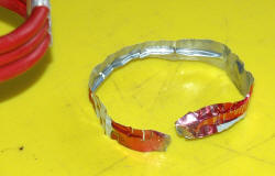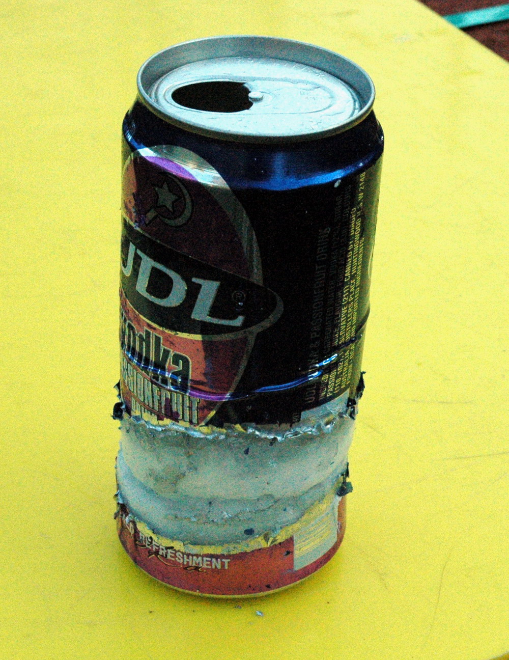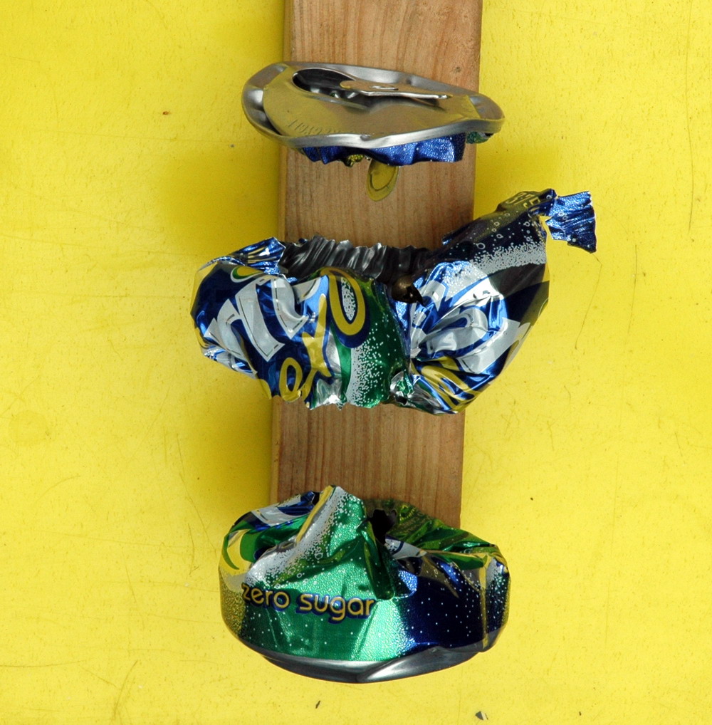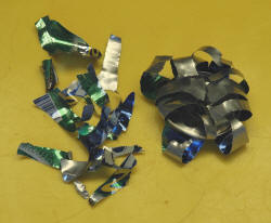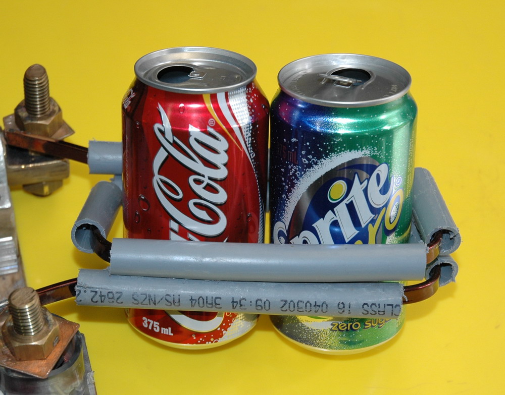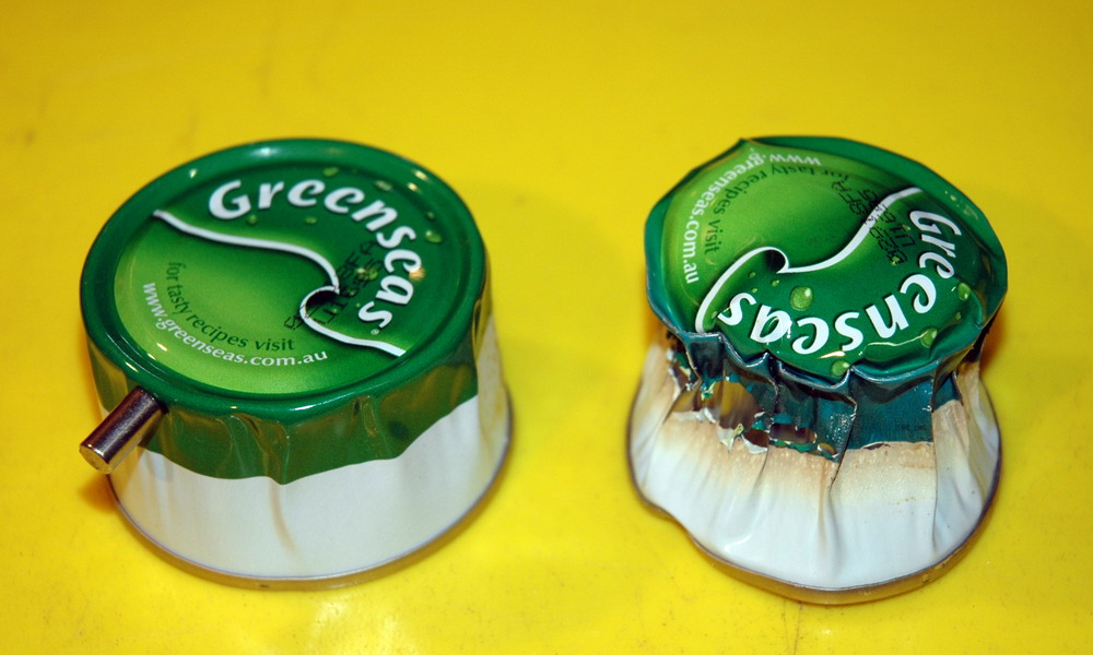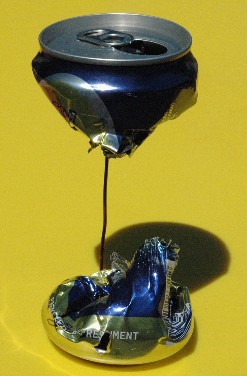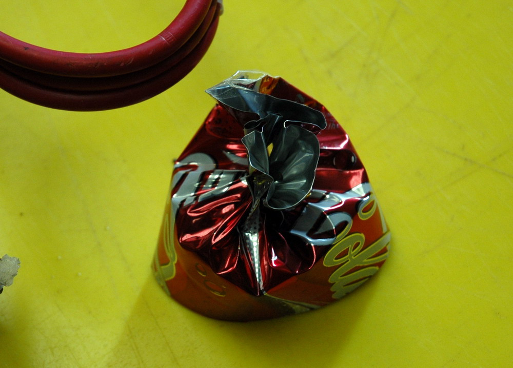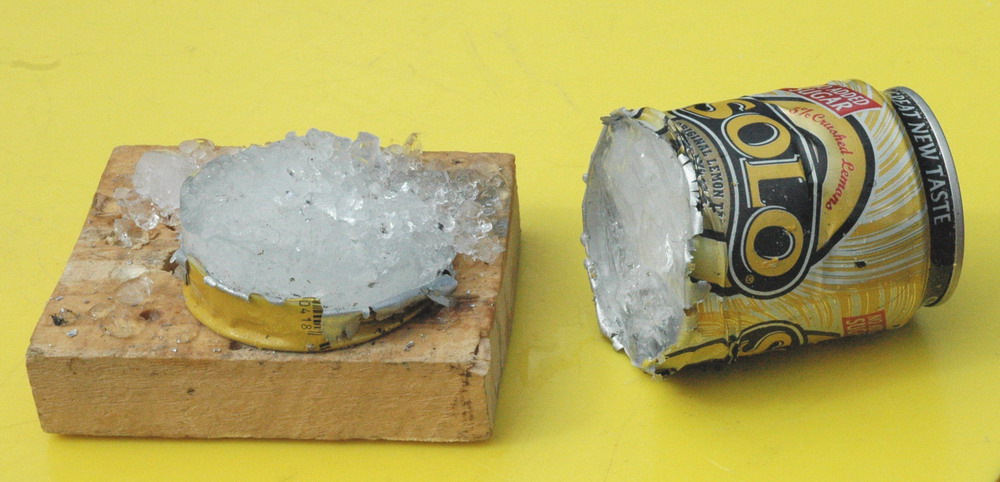 Next is tearing the can into strips with an internal coil. The left photo above shows the setup with the coil inside the can to explode rather than implode the can. The wooden block in the centre is not needed as the net forces are outward. The right photo shows the can torn into strips which were blown away on the free end and curled around the attached end like a large dead insect. The left photo above shows the setup with two cans in one coil. The centre photo shows the two cans crushed together. The right photo shows toucans.