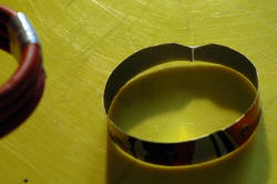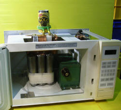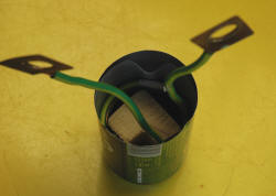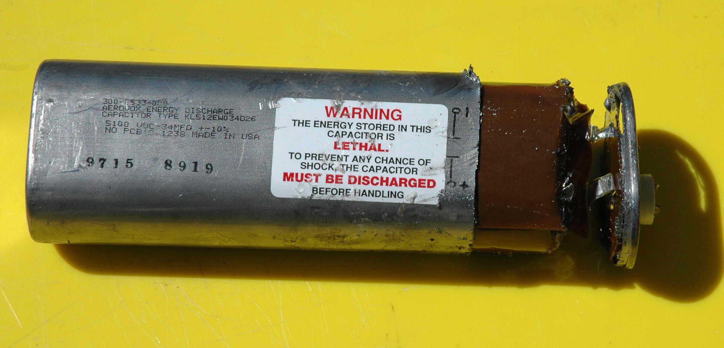 (3kJ) Aug 2005 The left photo above shows the capacitor bank, gap contacts and crushing coil next to a can crushed recently. The centre photo shows a close up of the tungsten contacts and the movable switch arm attached by heavy braid. The right photo shows a through the middle shot with the connections to the capacitors. The left photo above shows a smaller coil setup. The centre photo shows the coil mounted inside a can and the effects of it with expansion rather than crushing. The right photo shows a can which had 3 turns wound lengthways but the power was inadequate to crush it. At this stage I had strong suspicions that the caps were failing. The top left photo above shows the partially finished unit with the 6 defib caps mounted into a microwave oven case with an NST for charging. The top centre photo shows the defibrillator paddle that I use as a remote switch. The top right photo shows the functioning unit as set up for public display. The bottom photo shows it completed with signs and instructions. The can crusher has a flip open front which has the active HV covered. The coil can be angled to shoot an aluminium ring forwards as well. The switching is mechanical with tungsten contacts by a solenoid, triggered by the switch on one defibrillator paddle. There is a voltmeter and a red strobe to indicated charging obscured by the paddle in the pic. The 6 caps shown had died however so they were removed and 4 new ones were added to the original 2 larger defib caps to give a total of 3 kJ. I strongly suspect that these have now died too. The photo shows the cancrusher setup included in my public demo that I set up for the Physics Dept during the University of Western Australia open day on Sept 20, 2005. It was a popular display with both the can crusher and the Tesla coil generating large noises to bring the curious from afar. I did lots of demos crushing both light and standard strength beer cans with a good crowd response. Although it crushed the cans well it was probably only due to the original large defib caps at 1 kJ that were still functioning. The whole idea of using defib caps is flawed without correcting the voltage reversal. So, time to move on but not before an autopsy of one of the caps.