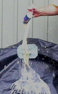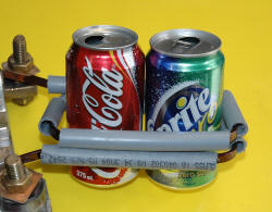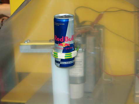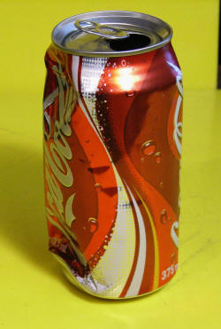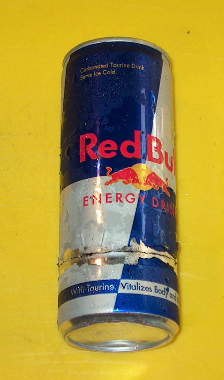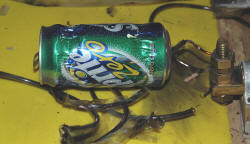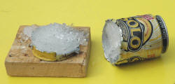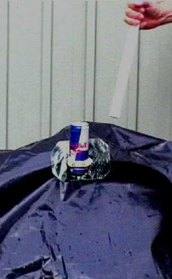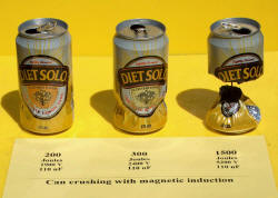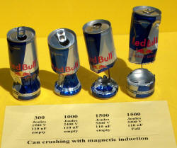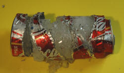 (and tear in halfer!) 2005 The can before and after. Note the distorted windings where a short circuit has occurred and vaporized some of the wire. One wonders how many turns there were effectively. Video of the can being torn in half (720 k but worth the download for the few frames with action. Sound is good too). Watch the voltmeter too. There is noticeable crushing at 200 J, better at 300 J and the can tears apart at 1500 J. Also dependent on the turns used. Note that 3 turns at 2400 V 110 uF (300 J) had an effect but 3 turns at 5200 V 35 uF (300 J) had no effect. So experimentation is called for. Enlarge the picture and you can see the "5% crushed lemons" and "low joule" labeling! Picture above shows the smaller Red Bull cans crushed at various energies and the effect of crushing a full can. The full can is interesting and bears further analysis. My interpretation is that the thermal and mechanical effects are on such a rapid timeframe that there is no conducting away of heat but the fluid has inertia and incompressibility. This has the effect of preventing the aluminium from folding in to the centre. It remains in the area of highest field which is right in contact with the coils. Hence, can disruption into the two halves is enhanced and since there is no infolding the "cut" is cleaner. Note that the energies on the photo are incorrect and should be 200J, 300J, 1500J and 1500J. The fluid in the can undergoes a major drop in pressure as the two halves of the can start to separate. Hence the observation above that the upper part of the can is folded in. It is sucked in by low pressure rather than by the induced field. This process is symmetrical and the net result is that the fluid forms a central column that stretches and becomes fountain shaped as in the video. Video (700 k) shows effect of crushing a full can. The can rapidly disappears leaving a long stream of fluid. Look at it frame by frame if you can. Some frame grabs at 1/120 second from a video sequence on tearing apart a full can. This shows the results of attempting to crush a frozen can. Although it can't crush the can does separate with a fine almost laser like crack with separation of the adjacent paintwork.