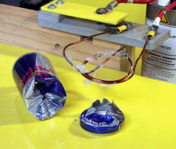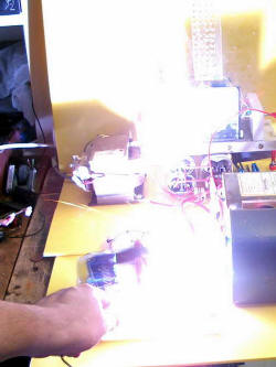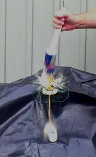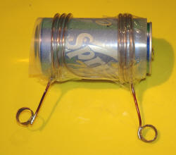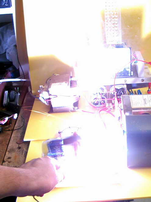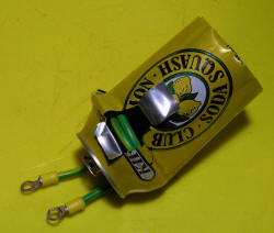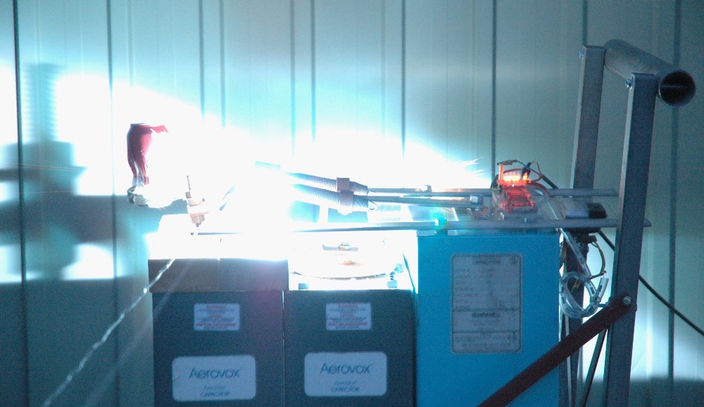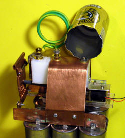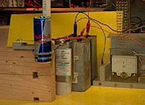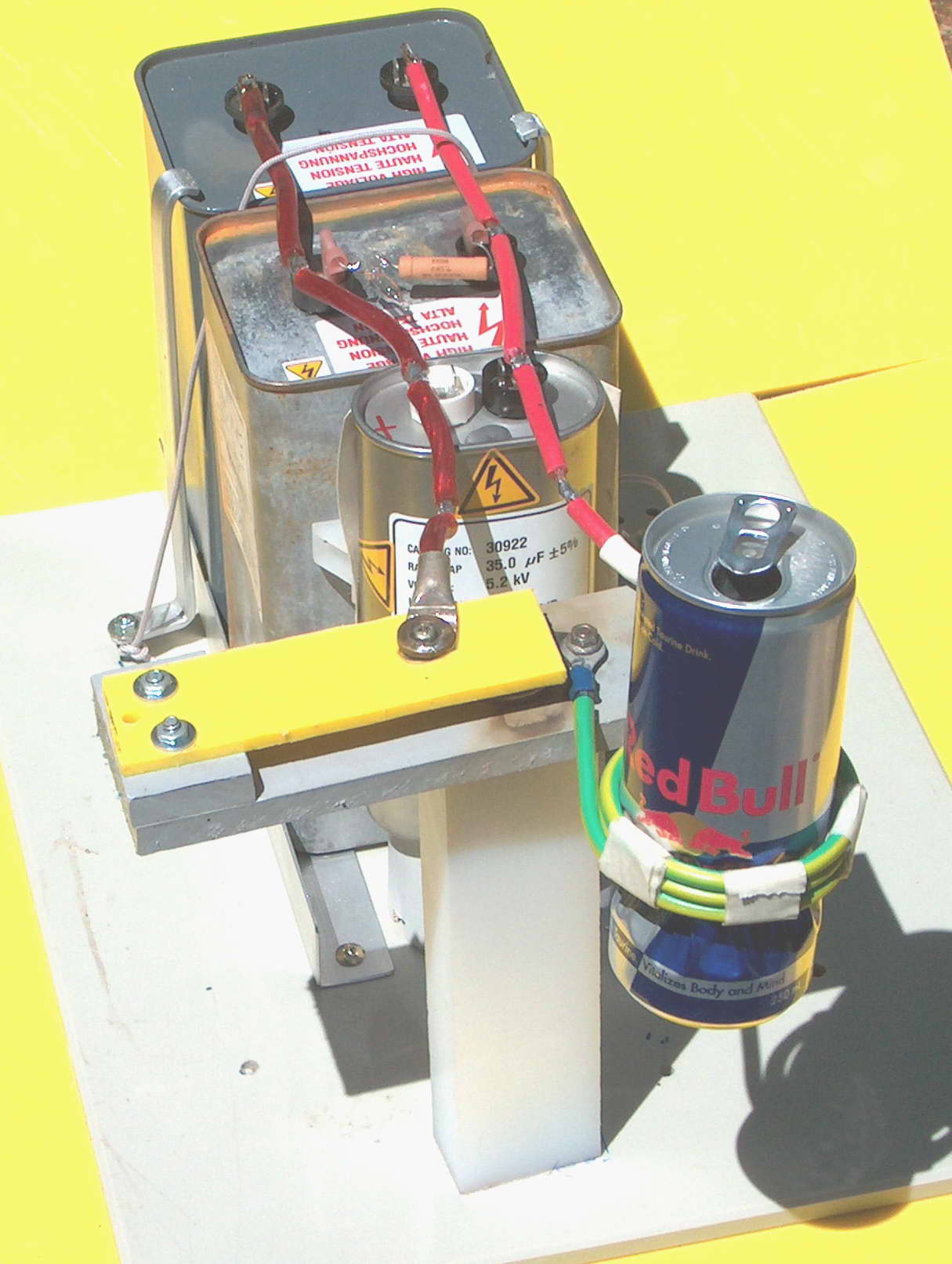 (1000 joule) 2004 The left photo above shows the coil made from 8 turns of 2 mm wire. Most can crushers only use a few turns. I have not tried this before as I believed that I did not have enough power to crush a can. Interestingly my 800 V supply with SCR switching barely makes a dent in the can although the delivered energy of 1500 joules is greater. A rapid rise time is important. The centre photo shows the flash when it fires. The right photo shows the momentary trigger switch (the grey and yellow plastic device above) with large metal contacts. I have added a 2 kV low intensity arc to show the contact points. Not really cool like a triggered spark gap. On one occasion the can shorted the coil and I could feel the blast wave from the spark. I wear hearing and eye protection and look away (while firing and taking the picture)!