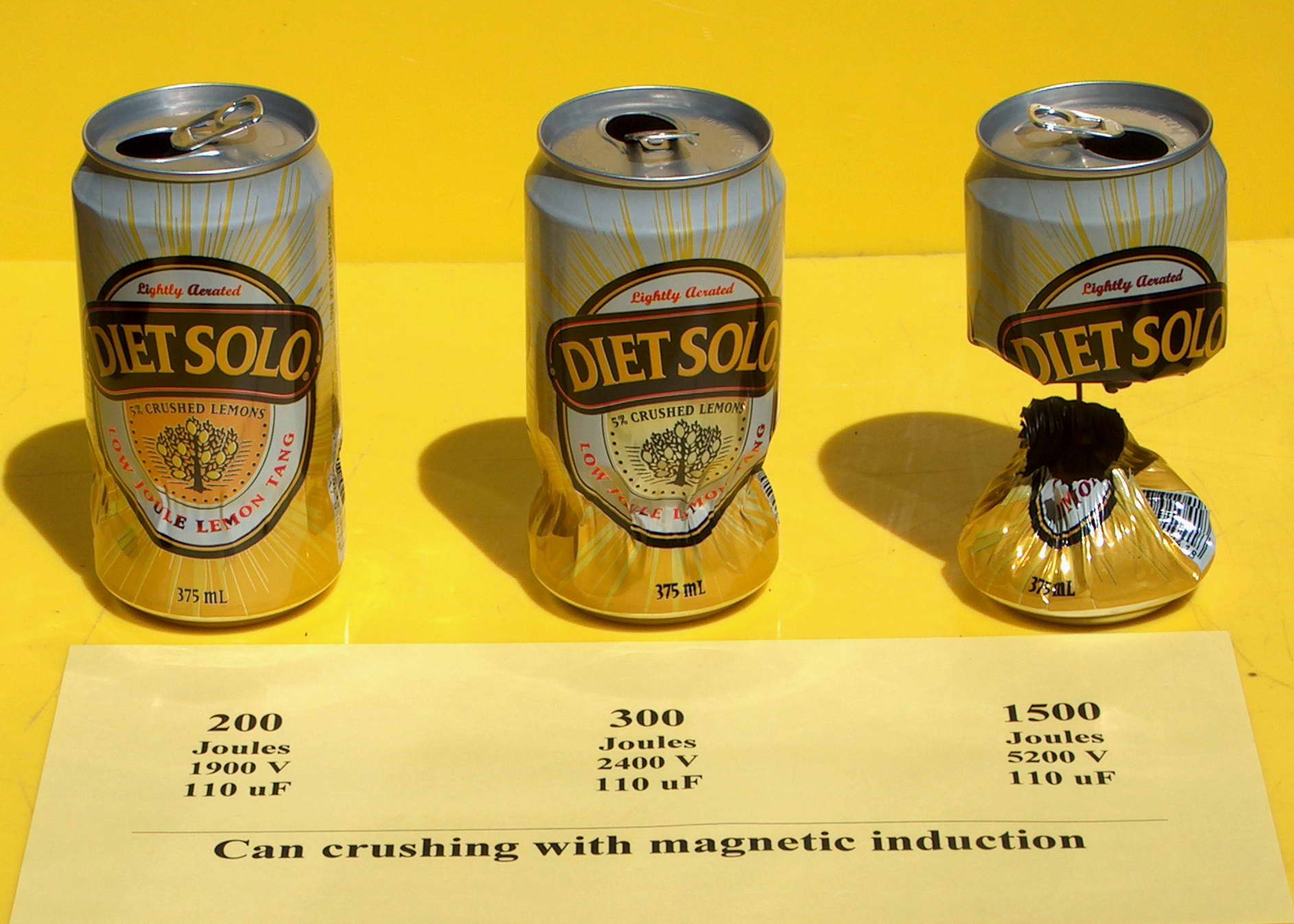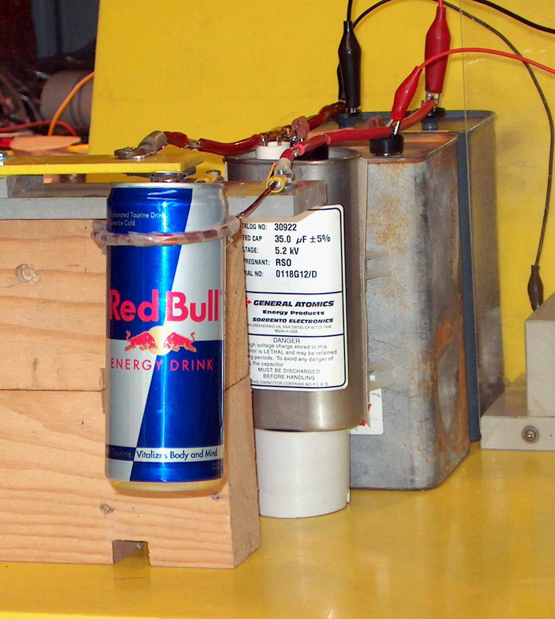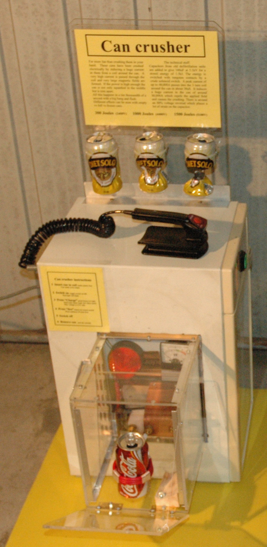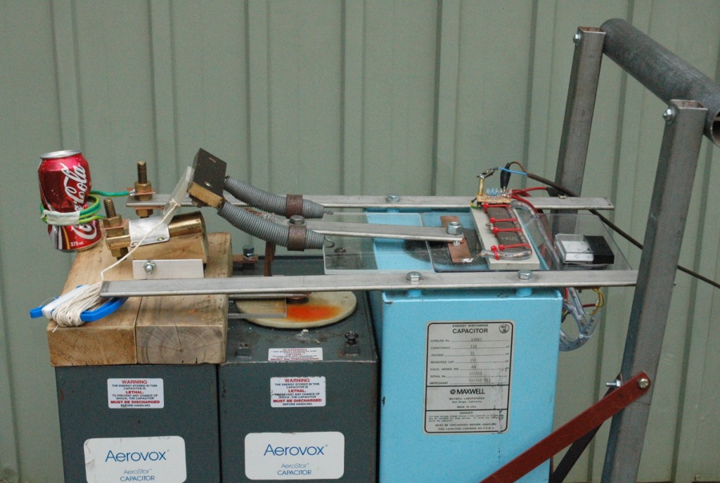 Brown University http://web.a-znet.com/~teslacoiler/high_voltage.htm PFC caps http://cas.umkc.edu/physics/sps/projects/cancrusher/cancrusher.html U of Missouri Kansas City http://www.geocities.com/yurtle_t/experiments/pulse_discharge.htm 10 kJ coin shrinker Yurtle Turtle http://members.tripod.com/extreme_skier/cancrusher/ 2 kJ Tristan Stewart (Mad coiler) Pics of can torn apart. http://www.physics.umd.edu/lecdem/outreach/phun.htm Travelling demos "Physics is Phun" tears can in half. U of Maryland http://www.physics.umd.edu/lecdem/services/demos/demosk2/k2-62.htm Slo-mo video University of Maryland, College Park, MD Shoots ends 30 ft