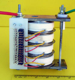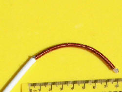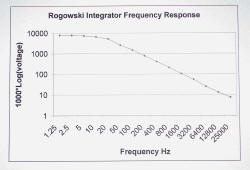 multimeter doesn't have a 100 000 amp scale) 2005 To measure these currents without connecting wires to the high voltage, I have used a small inefficient transformer which does not have a magnetic core called a Rogowski coil. There is no magnetic core to saturate so the pulse response is good. It is a transformer so cannot measure DC, however. The primary of this transformer is only one wire which is the main current carrying cable. It will respond to the rate of change of magnetic field or current so has to be "integrated" using, in my case, a passive setup with a resistor of 2.2 k ohms in series followed by a parallel capacitor of 0.01 uF. The left photo above shows the oscilloscope with the actual current waveform upper trace (the Rogowski coil output with passive integration) and the lower one shows the raw Rogowski coil output which shows rate of current change (di/dt). The middle photo is the winding of the Rogowski coil onto flexible coaxial cable. The coax centre is the return wire. The right photo shows the Rogowski coil wrapped around the main cable. So far so good but it needs to be calibrated to work out what current in the main cable gives what output of the Rogowski coil. This is best done at the frequency concerned.