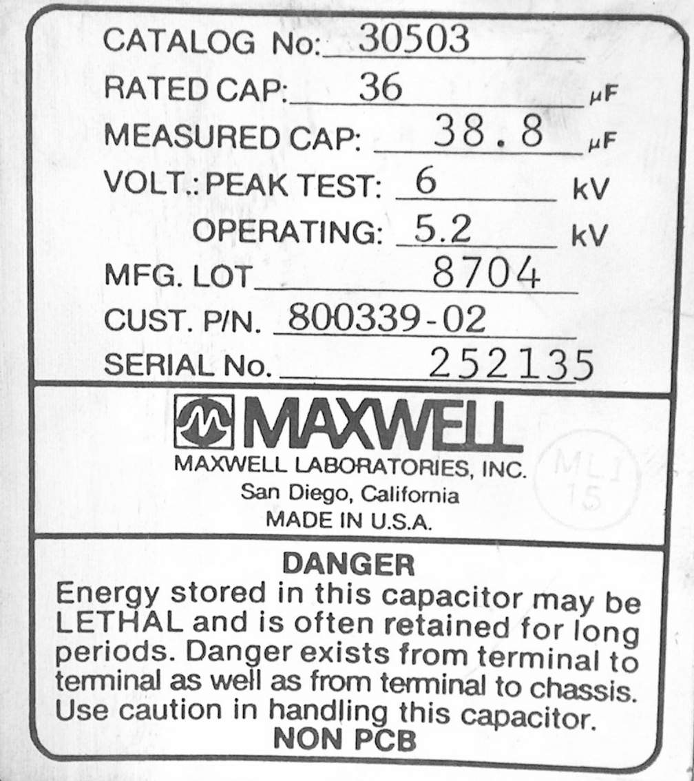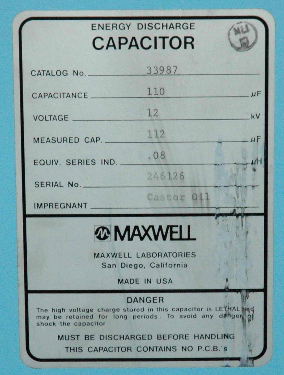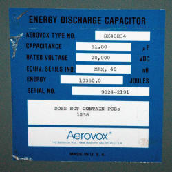 copper plate as one contact (I will replace with brass later). The left photo shows the light blue Maxwell capacitor specs. 110 uF, 12 kV, 8 kJ, 75 kg. General Atomics have given the specs as 80 % rated voltage reversal at 100 kA. 75 A RMS CW current. Design life 30,000 shots or 1600 h DC. Inductance 40 nH. The right photo shows the 2 gray Aerovox capacitor specs. 50 uF, 20 kV, 10 kJ each. They are smaller and despite the higher energy are rated at only 20 % reversal. They were apparently used for 'Star Wars' laser work and saw only 2 hours service in the 1980's. These are all proper energy discharge capacitors with low inductance low profile, high current terminals. They are all second hand so remaining life is not known. I built the special trolley for it to accommodate various experiments as 195 kg is just too much for me to lump around. The total energy able to be stored of 28 kJ can be compared with the kinetic energy of an AK-47 bullet of 2 kJ in flight. An exceptional level of care is required to avoid unintentional discharge in close proximity in view of the extreme sound / flash / EMP levels. Also metal fragments of exploding coils are of high velocity and very capable of injury. With these I hope to be able to do a variety of interesting things such as extreme can crushing, coin shrinking, exploding wires, and projectiles as well as a couple of interesting pulsed Tesla coil experiments.