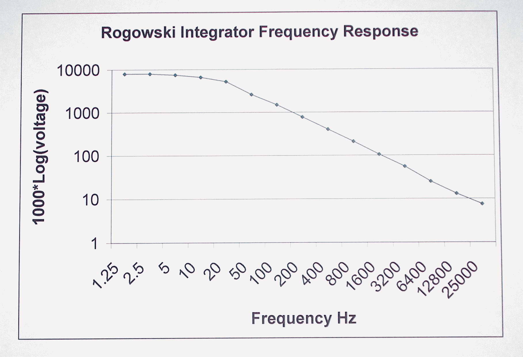 of cables, meters, high voltage and high frequency power. The oscilloscope shot of an actual firing which shows current at 850 kA/div i.e. peak of 15 kA (15,000 A) and 20 us/div time base on channel B. I still haven't found the top half of the can yet after it went ricocheting around my shed. Now for more flexibility I have made an 'active' Rogowski integrator using a fast integrated circuit op amp and a few bells and whistles. Left photo shows me working on calibrating an active integrator for my Rogowski coil using a TL072 op amp to replace the previous passive integrator. Middle photo shows the frequency vs output voltage for the active integrator. Right photo shows the completed integrator with a peak and hold detector. The Rogowski coil is the continuation of the white cable around the orange PVC support. The large black cable carries the high current under test. The thinner black cable is 10 turns through the Rogowski coil for testing at 20 A 50 Hz. I have two inputs 100 A/V (full scale 1000 A peak) and 5 kA/V (full scale 50 kA peak). Calibration was at 50 Hz but should be OK to 25 kHz from the graph above. It uses about +/- 16 V supply which is poorly regulated but current draw is only 3 mA. Output waveform is read on the CRO.