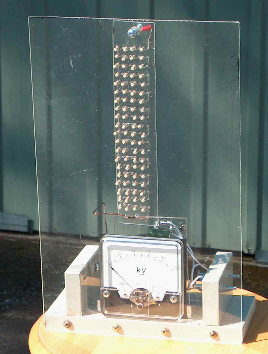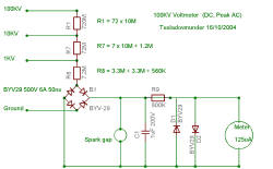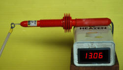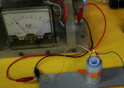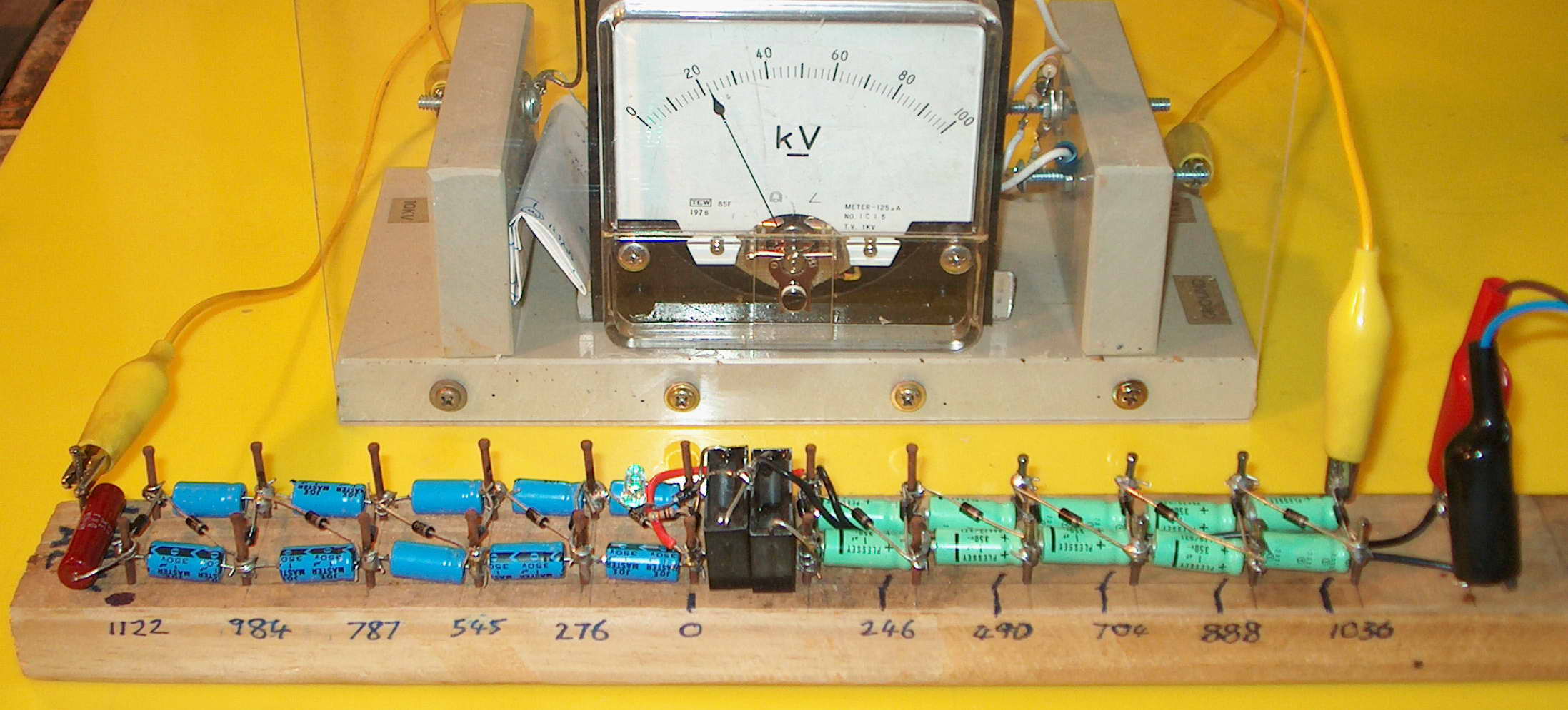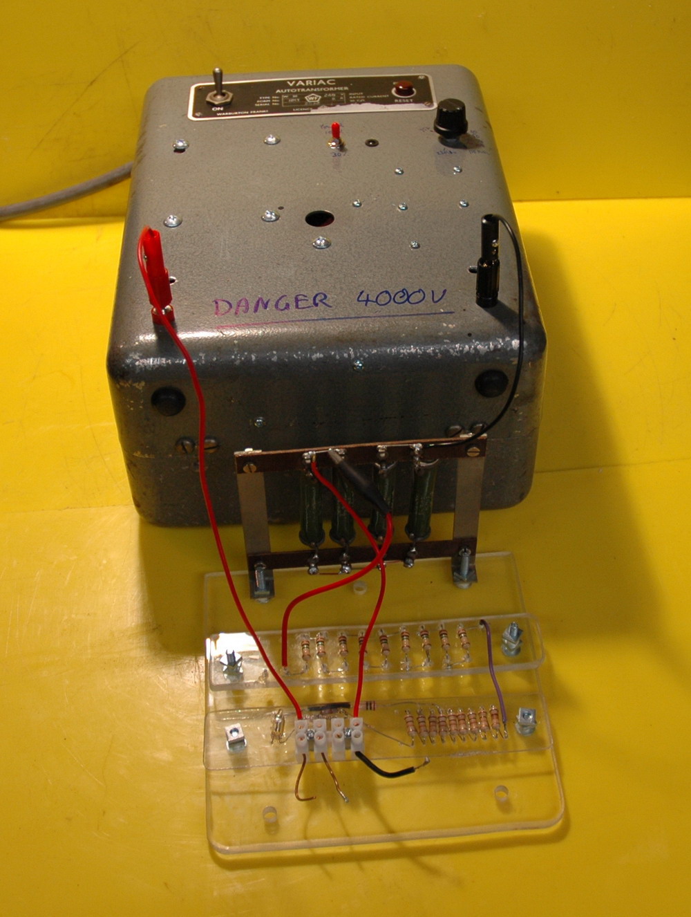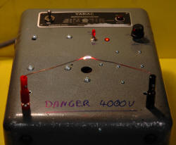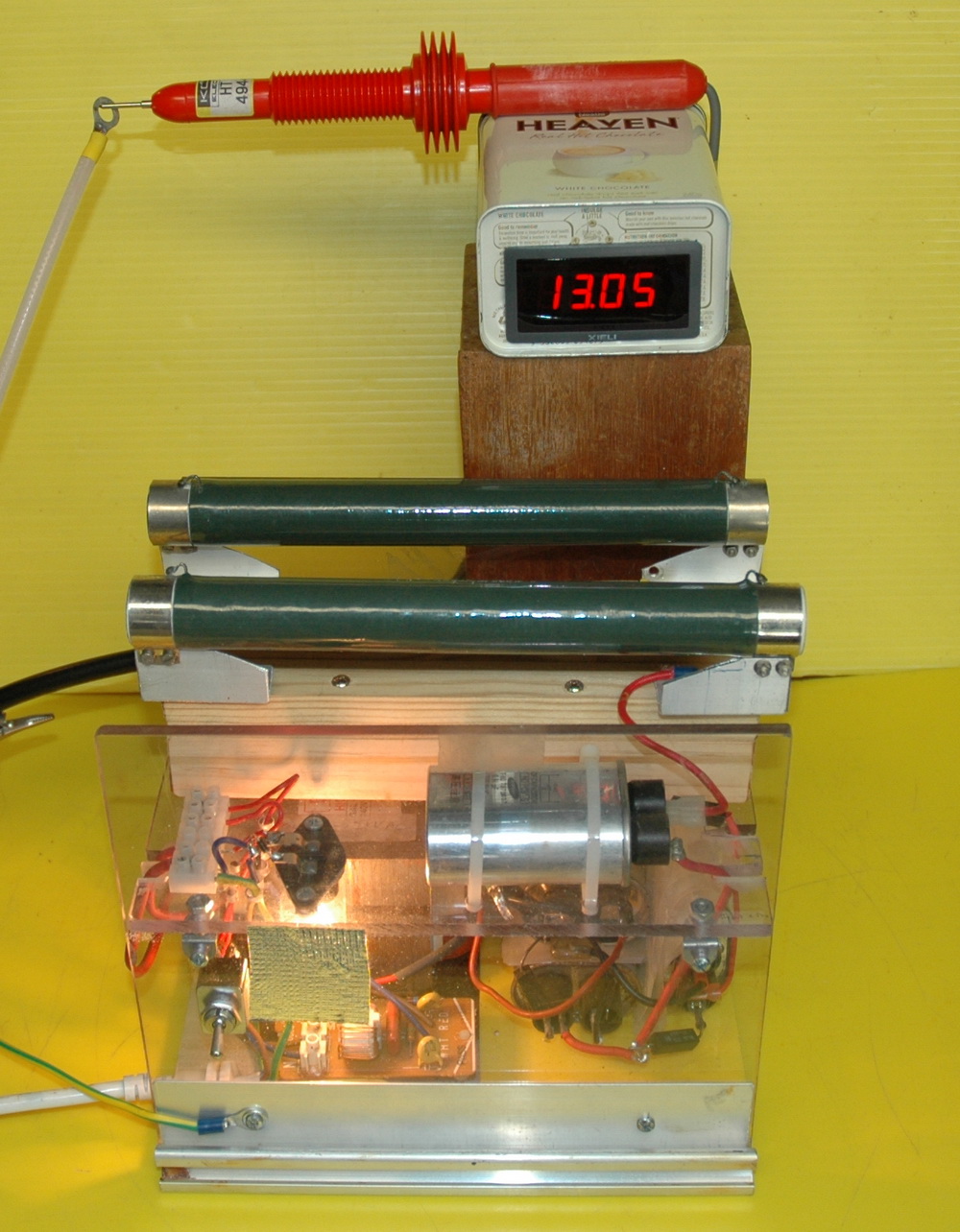 Above shows the meter reading 13.06 kV using a 30 kV rated HV probe. The leads and switch are at the back. There is some rudimentary HV protection using a neon pilot globe, capacitor and a small toroidal coil in the main lead.