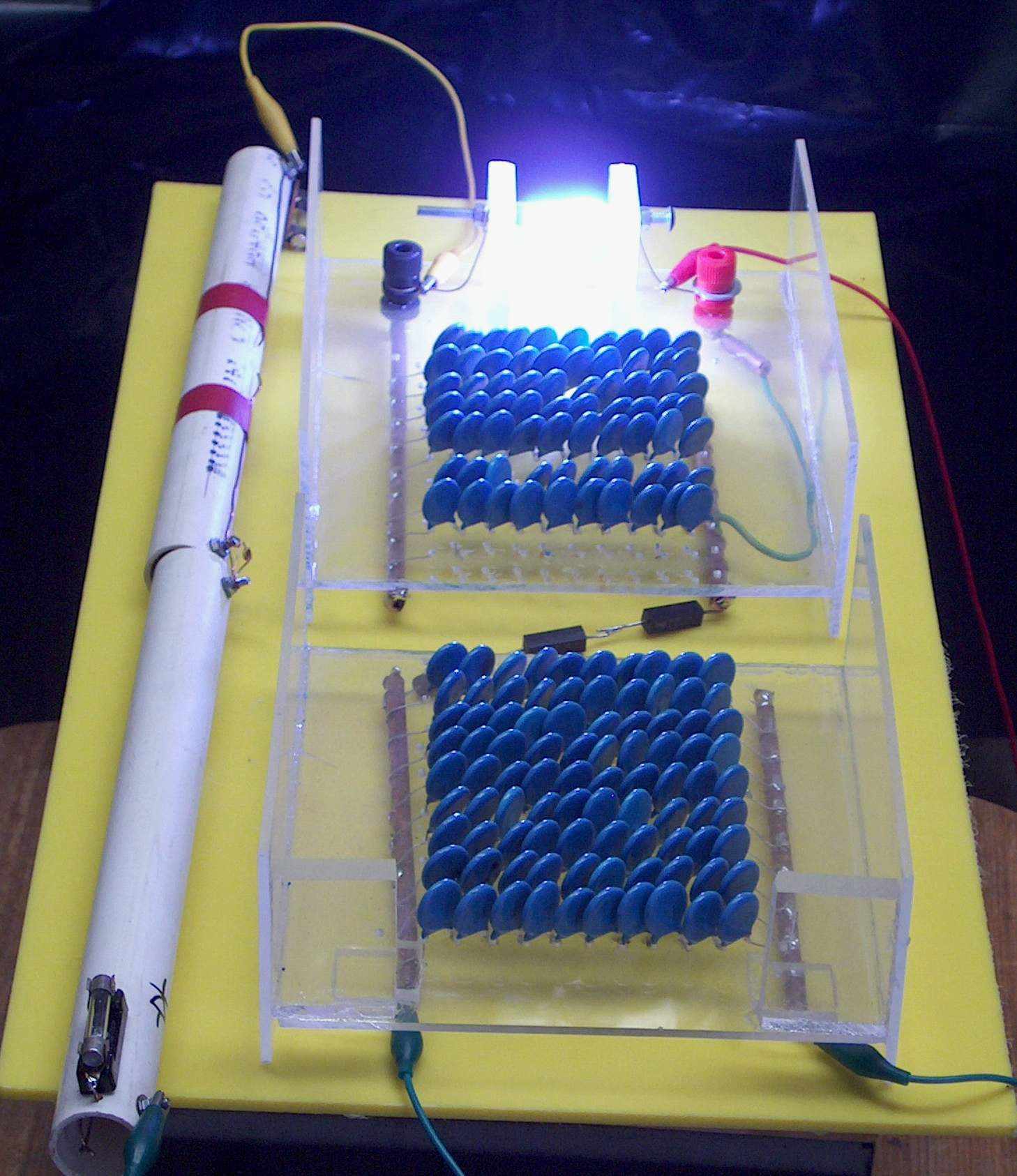 2003 The left photo is of my poorly designed ceramic capacitor bank cut in half with the blown capacitors removed. I blew out 40 out of the 200 capacitors before I got a satisfactory photo. Of course this is very stressful for capacitors. The right photo is the same diode setup but with my rolled polyethylene/aluminium foil capacitors of 48 nF and 15 nF giving a much more intense spark with some steel wool to give the sparkles.
