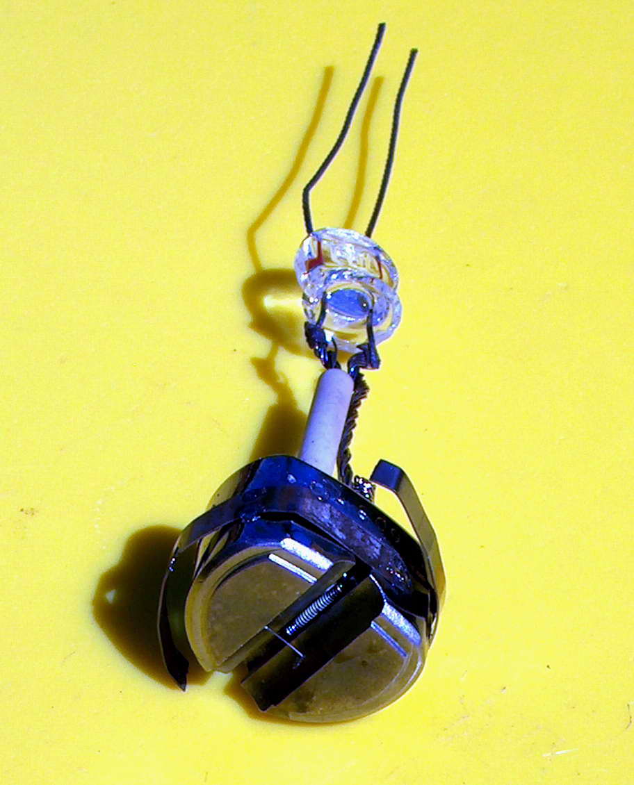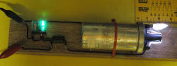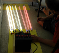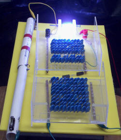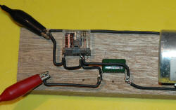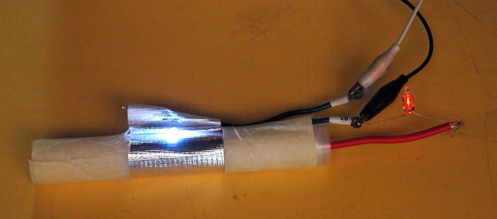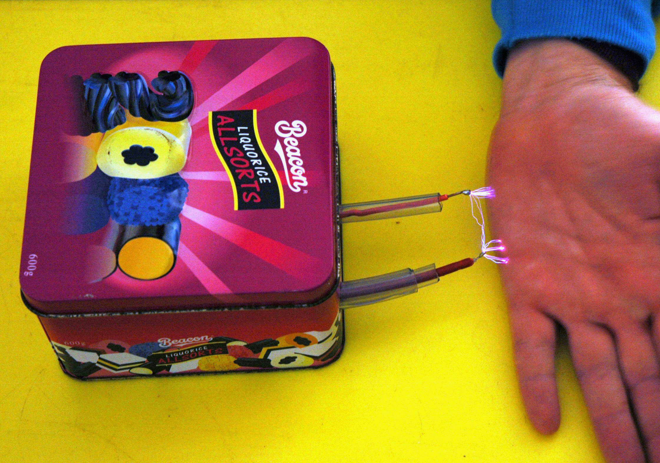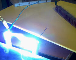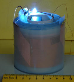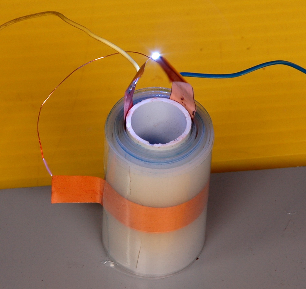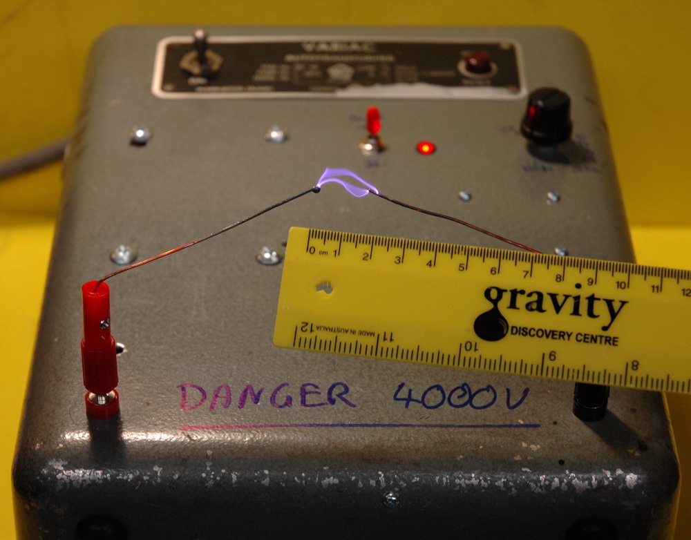 Instructions: The left photo shows the wiring layout. The switch (equivalent of the "points" in an ignition system) is the two wires at bottom right. To operate, touch the two wires together. You should see a very small spark where the wires touch. Current is now flowing into the coil and has built up an internal magnetic field. Immediately lift the wire off to break the contact. The collapsing field creates a voltage spike of hundreds of volts which is raised to perhaps 30,000 volts at the output. You will see another spark where the wires were touching, larger this time. In most cases you will see a long high voltage spark from the aluminum foil to one of the terminals. The right photo show a 2 second exposure with several long sparks. So you have completed it and have made some sparks. But is it safe? Yes and no. A shock from this to is similar to being pricked with a needle. Not pleasant but tolerable. Of course if you jump backward and trip over and hit your head then yes you may do some injury. Here is a spark onto my arm. I had to turn on the camera remote and turn on the sparks with my left hand, seen only as a blur in this 2 second exposure. It took about 10 shocks to get a reasonable picture. My right arm receiving the shock will jump involuntarily. That's how muscles work and was discovered by Galvani giving shocks to frog legs. Anyway, I survived unscathed although I probably get more practice than most. So what can you do with it? How about lighting up a lot of "dead" fluorescent lights? As you can see, some are more dead than others. Try testing conductivity of various objects like dry then wet wood or plastic. See how well it jumps through paper then thin plastic. Just a note. High voltage can damage electronic equipment like phones, ipods, TV's and computers. Keep it well away. 30,000 volts will jump 1 inch and 2-3 inches along the surface of insulation.