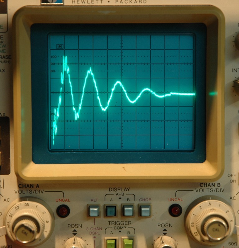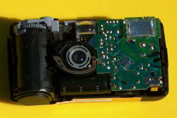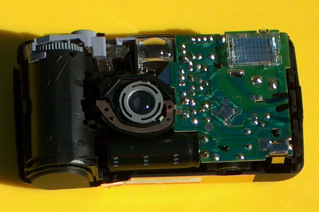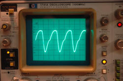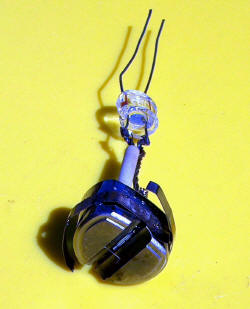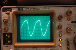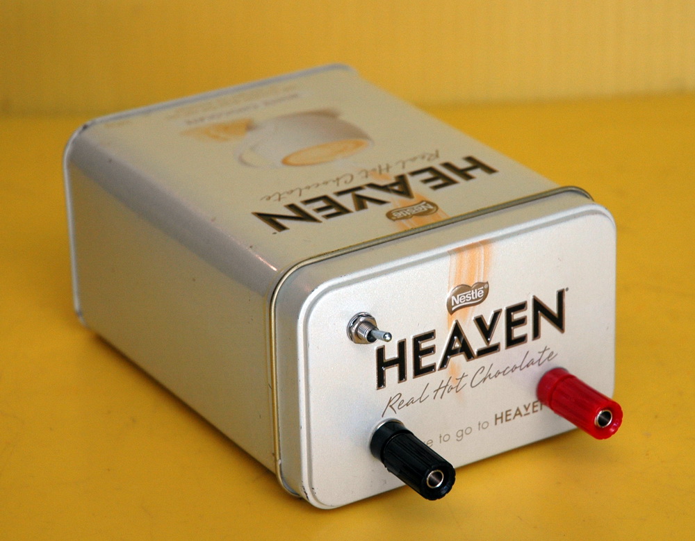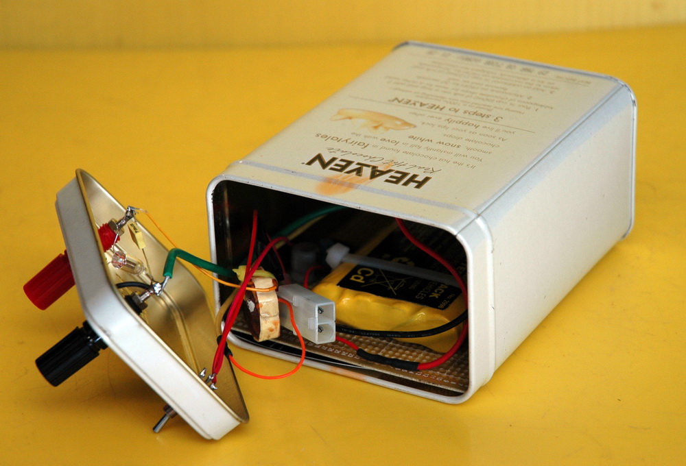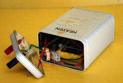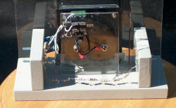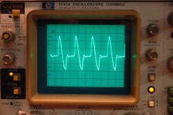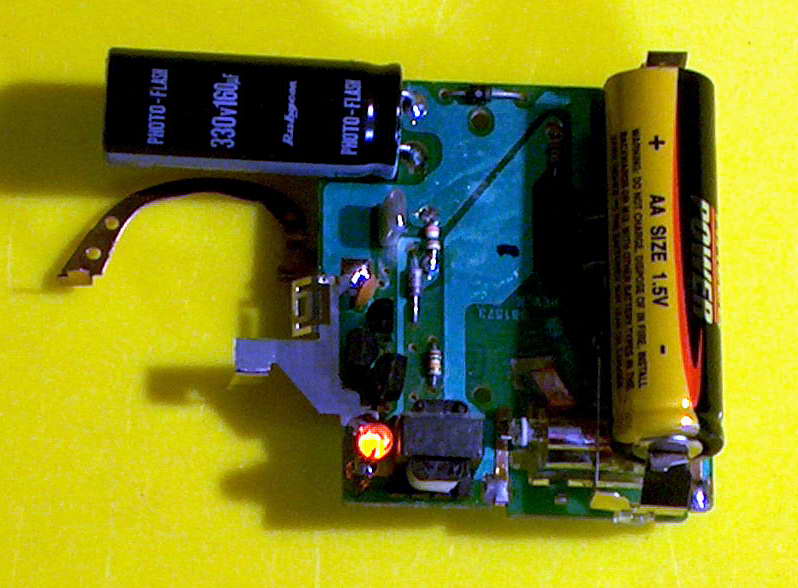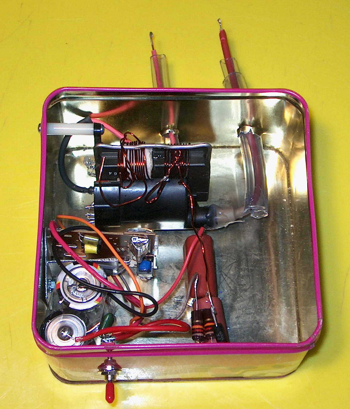2005 The disposable photoflash unit with the electronics removed shown charged by the 1.5 V battery. The completed box which produces a 1.5 inch spark with a repetition rate of about 2 Hz. It is "safe" to touch giving a mild pinprick sensation. This formed one part of my display at a University Expo recently where I was offering "free" electric shocks. I would demonstrate on my arm first before calling for volunteers and it was quite a popular display. This is the waveform of the output at 20 uS per division, which is a damped wave of around 25 kHz with a superimposed signal of about 1 MHz on top. It is about 40 kV at 20 uA but measurements are difficult at this frequency.