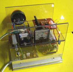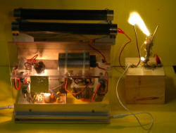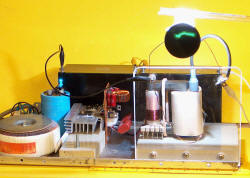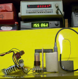 supply 13 kV DC 2005, 2008 The left photo shows a lash up of the charger, showing the various basic components including a red warning strobe to show it is charged. The right photo shows the partly built charger and 6 kV spark output is shown (drops to less than 1 kV once arc starts). To keep the HV and mains isolated and still feedback the voltage, I send pulses into a ferrite rod which will be picked up and trigger the solid state relay to turn off once the voltage has risen to the desired level. I have rewired this supply with an extra stage for higher voltage and added some big power resistors. This is to be used for charging my big capacitor bank. The photo above shows the latest reincarnation of this supply. Now with extra stages to boost to the 13 kV shown here plus the addition of two 50 kOhm 100 W resistors as current limiting. This is to handle the higher voltage of my big cap bank. This is based on a TV flyback coil and a single 2N3055 power transistor and other on-hand components giving a 1/2 inch spark at 20 V 3 A input. It runs at frequencies above the audible range and only under load is it heard as a whine when the frequency drops. This is one of my earliest HV setups but not particularly efficient. TV flyback HV supply 300W 2004