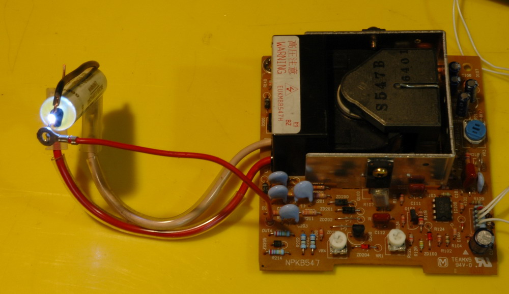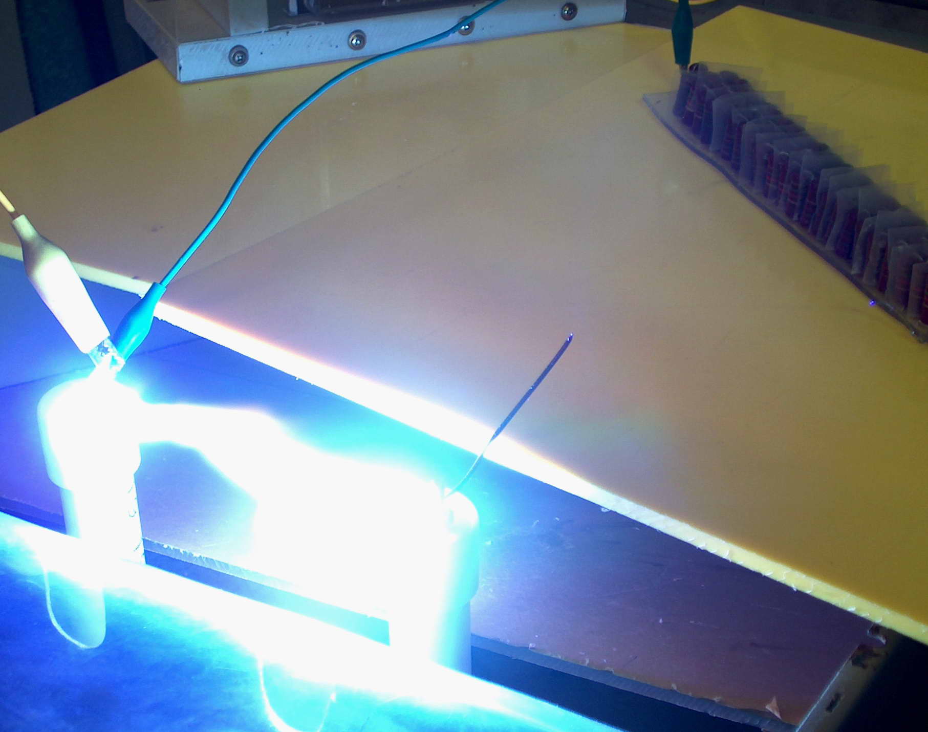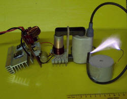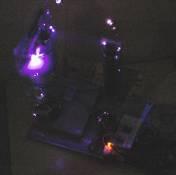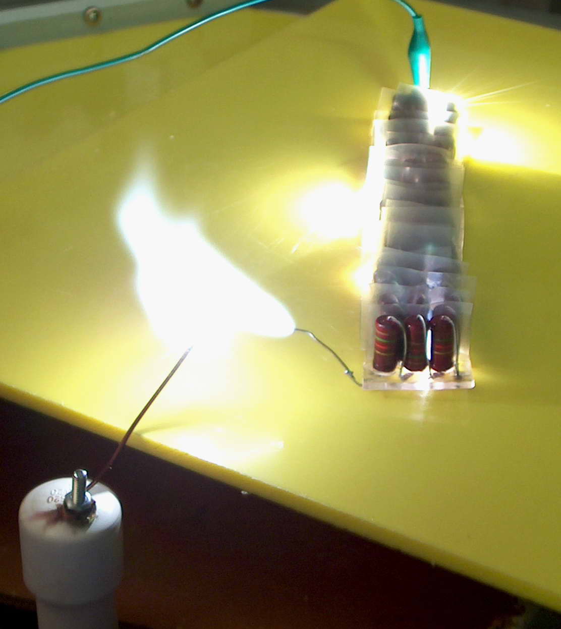 TV flyback HV supply 80kV DC 2005 The left photo shows it running with 4 inch sparks with limiting provided by several resistors. The right photo shows the corona in a time exposure.