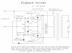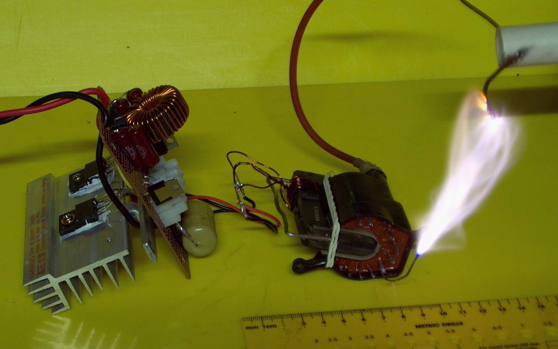 500 Volt, 9 A, 60 nS). The left photo is from a modern TV flyback transformer with core spacers removed and the exposed core wound with 10 turns centre-tapped of rather flimsy wire running about 250 W. On the right is an older but larger one. The older style flyback transformer here has the spacers removed and is a little more efficient. It is running at 44 kHz at 30 V, 6.3 A. (The meters are lying). The right photo shows a 1 inch DC arc with a 30 nF 40 kV cap added to the unit which now has a dedicated 37 V 10 A power supply. The intense spark is seen behind the filter made out of 2 welding goggle filters.