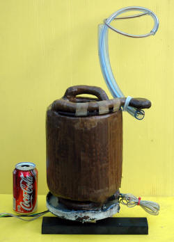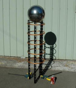 from an auto wreckers. Photo shows the identical circuit running 2 coils in 1972. This is a static electricity generator of the type used in displays which make your hair stand on end. It uses 2 inch rubber belt with fibre reinforcing which was the only non black belt I could find (black rubber is slightly conductive). Powered by a variable speed electric drill. Top load is 12 inch ducting. I have tried a 10 kV DC charging spray but there was no improvement over the standard triboelectric static generation. Maximum sparks on a low humidity day are about 2 inches. More work needs to be done. Winter and the increased humidity will put this on the back burner for a while. PVC is not ideal as it does tend to absorb a little moisture and polypropylene is better.