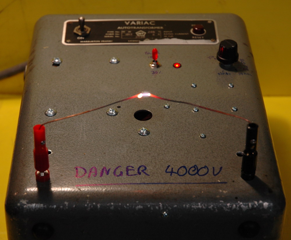 A nice 60 kV transformer and heavy dual variac for the kids to play with. |