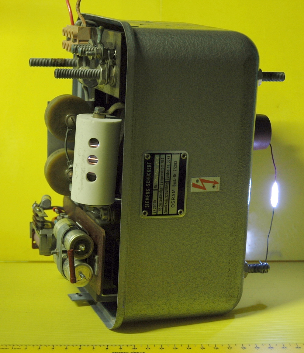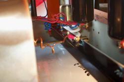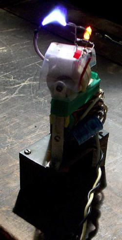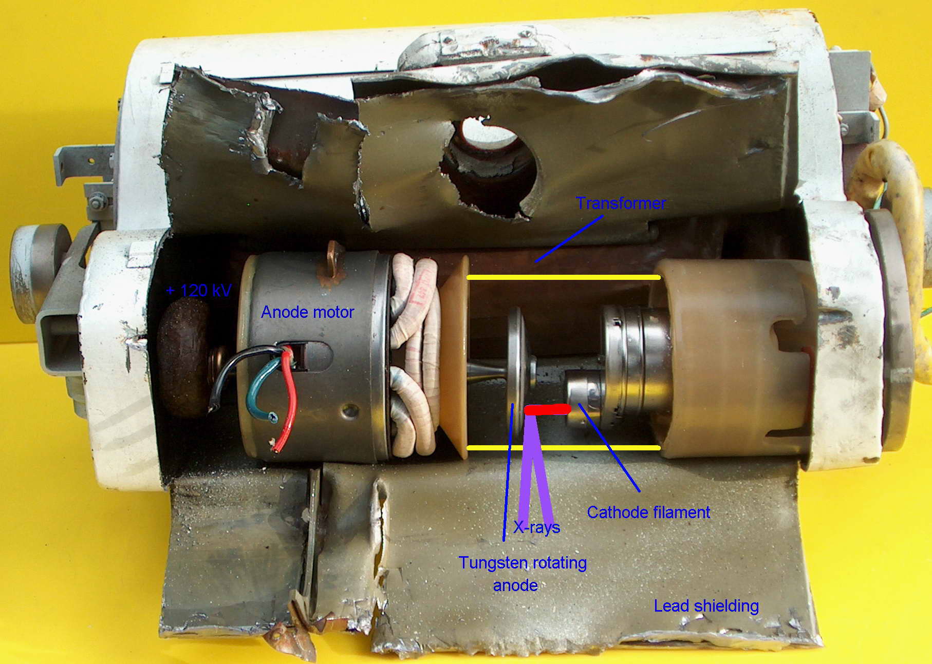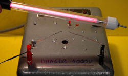 50 kV AC 2008 The sparks here are about 1 inch and you can see the multiply stacked gap firing as well. This is the internals of a Siemens 120kV x-ray tube head which includes the transformer (not rectified) and a rotating anode under oil sealed and lead shielded. The glass has been removed with the outline shown in yellow. The electron beam is shown in red and the x-rays in purple. The induction motor is outside the glass and works well on 250V with a phase delay with a 1 uF capacitor on the additional windings. The right picture is the filament on the cathode electron gun which I have joined to some glass feed through wire from a neon tube.