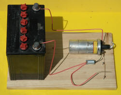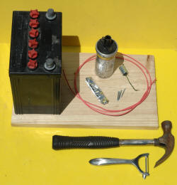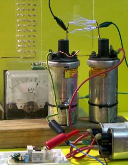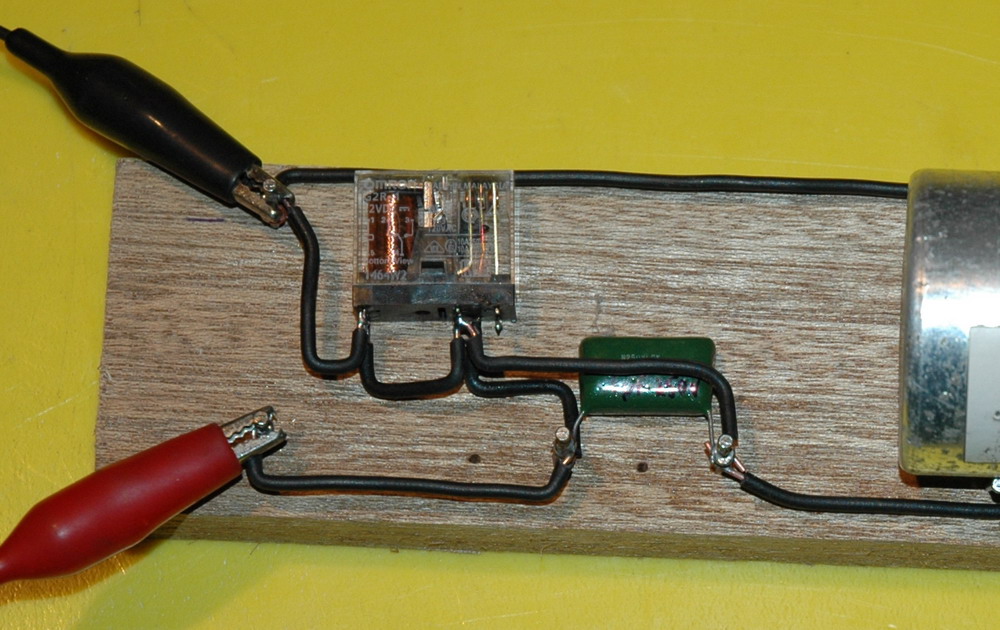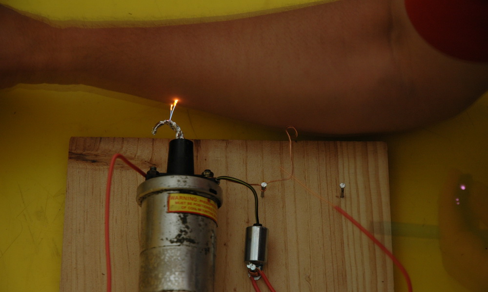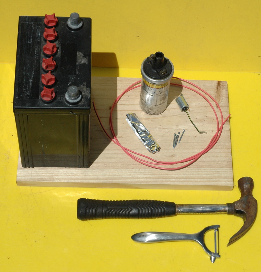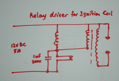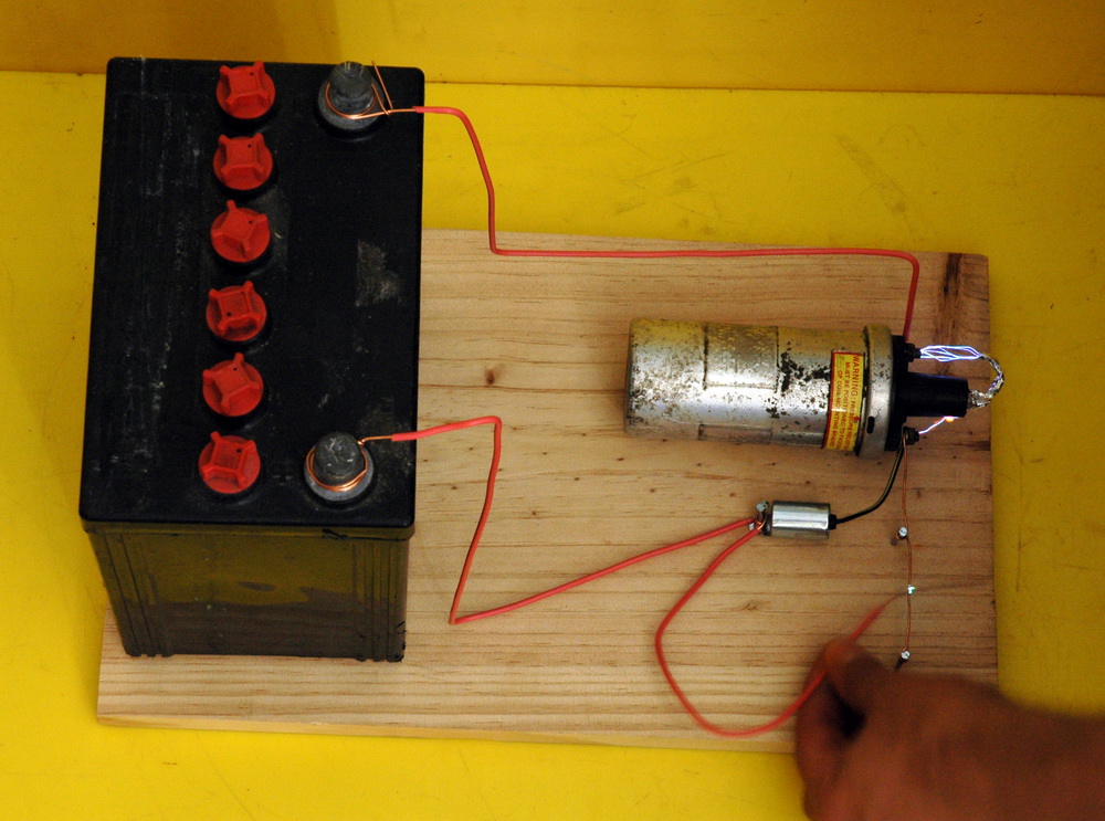 this: The top photo shows the ignition coil and relay running on 12 volts at 5 amps from a power supply, battery charger or car battery. There are only three parts. It uses a relay as a vibrator to turn current on and off rapidly to an ignition coil. The bottom left photo shows a close up of the wiring. The bottom right photo shows the schematic with the capacitor, relay and ignition coil.
