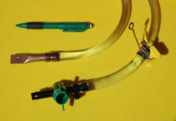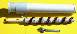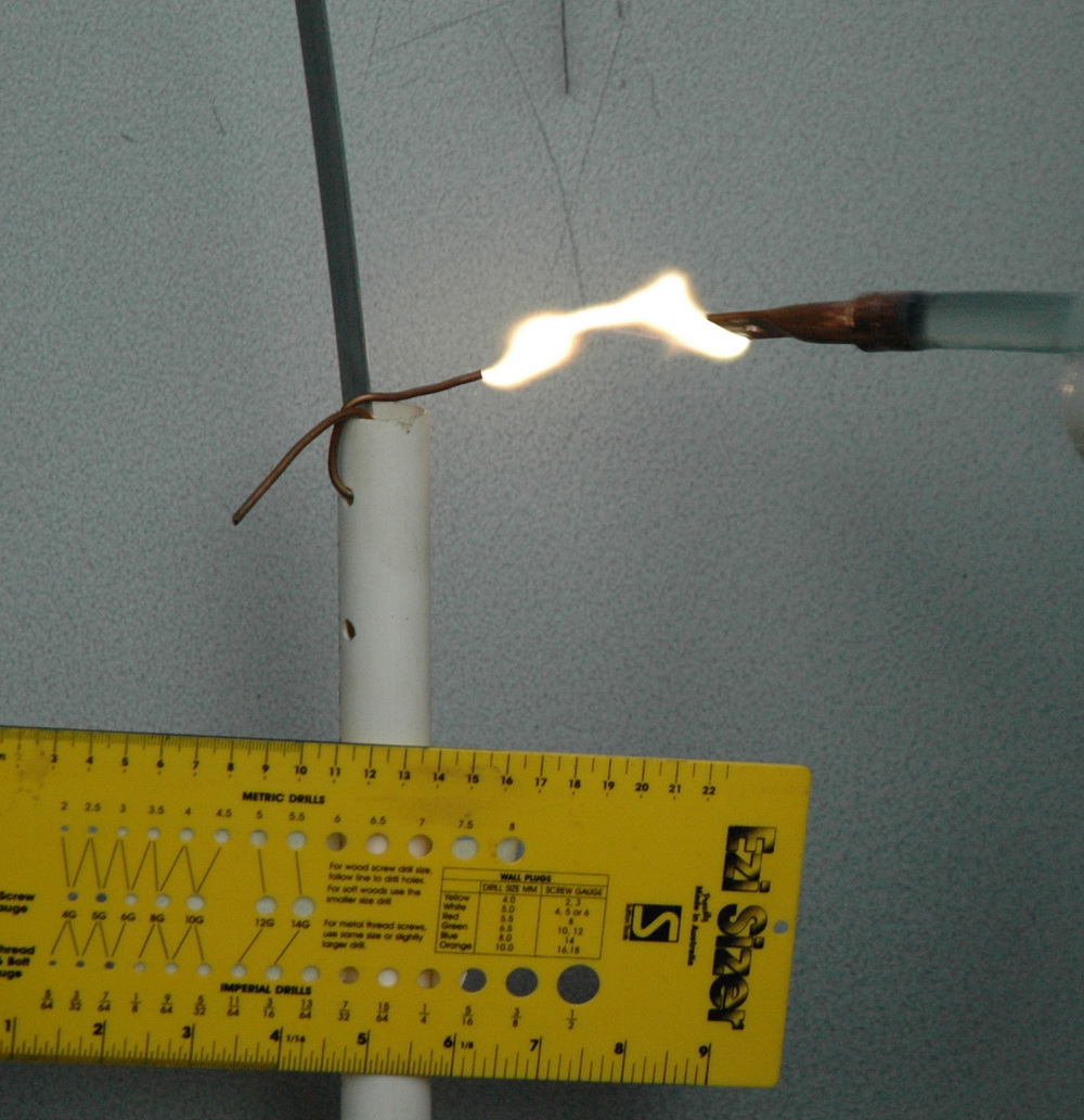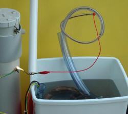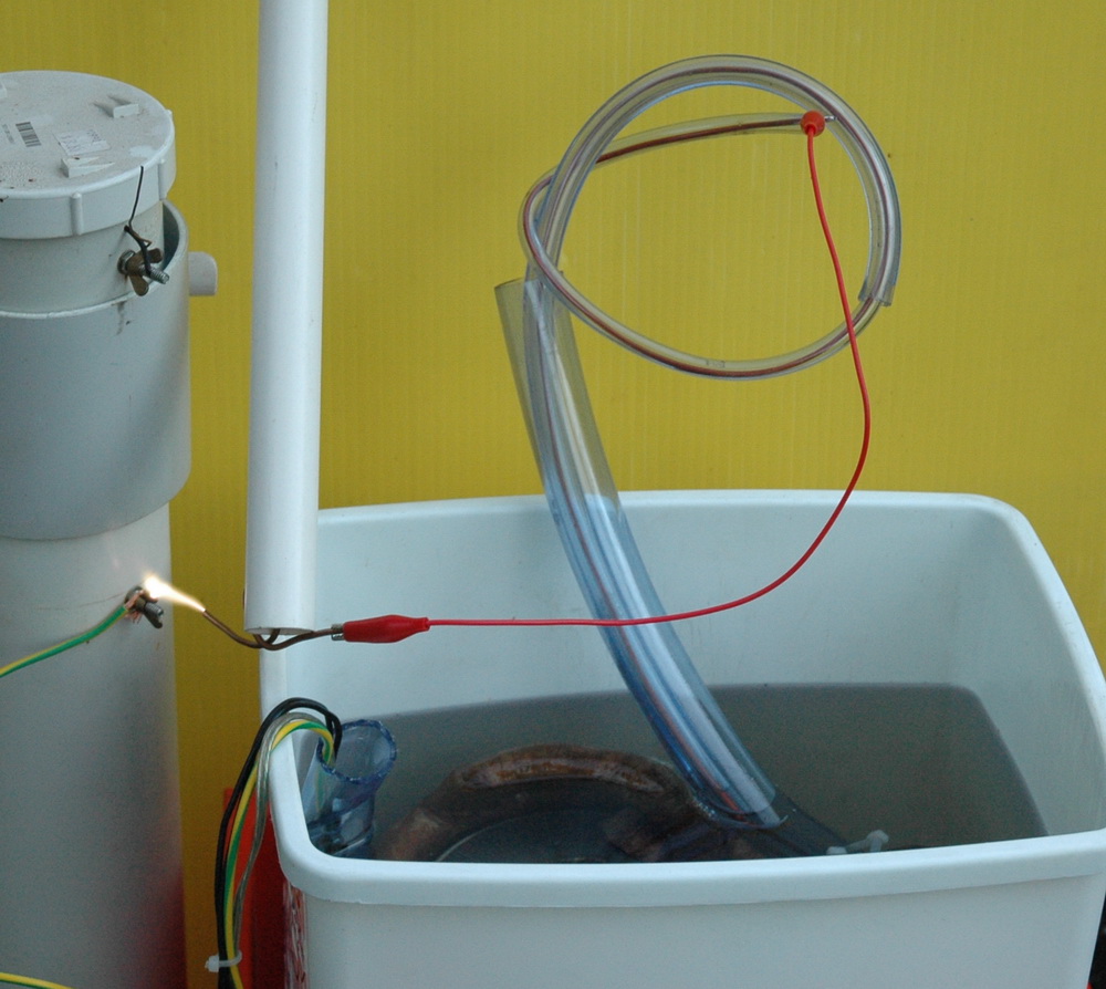 The left photo above shows the ends of the 2 m x 10mm tubing with copper tubing connectors and valve to allow air release or to replace the water if it becomes clouded or for a resistance change. The advantage of this construction is that it is not specifically inductive so sparks, like Tesla sparks will not try to jump across adjacent windings. The right photo shows sparks from a 60 kV supply. The resistor was set at 200 kOhms. The heat was enough to cause cavitation either with boiling or electrolysis but it survived fine without leaks.