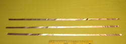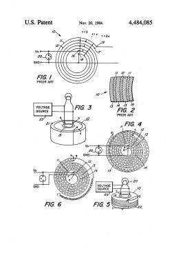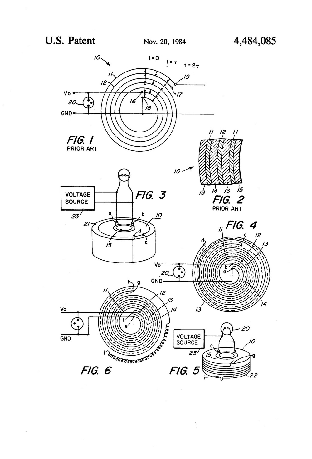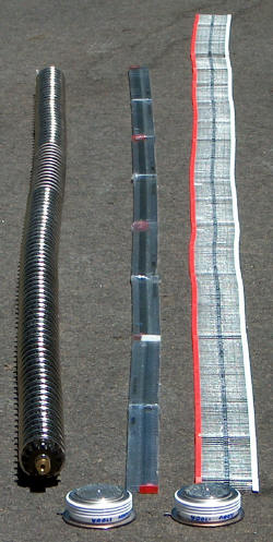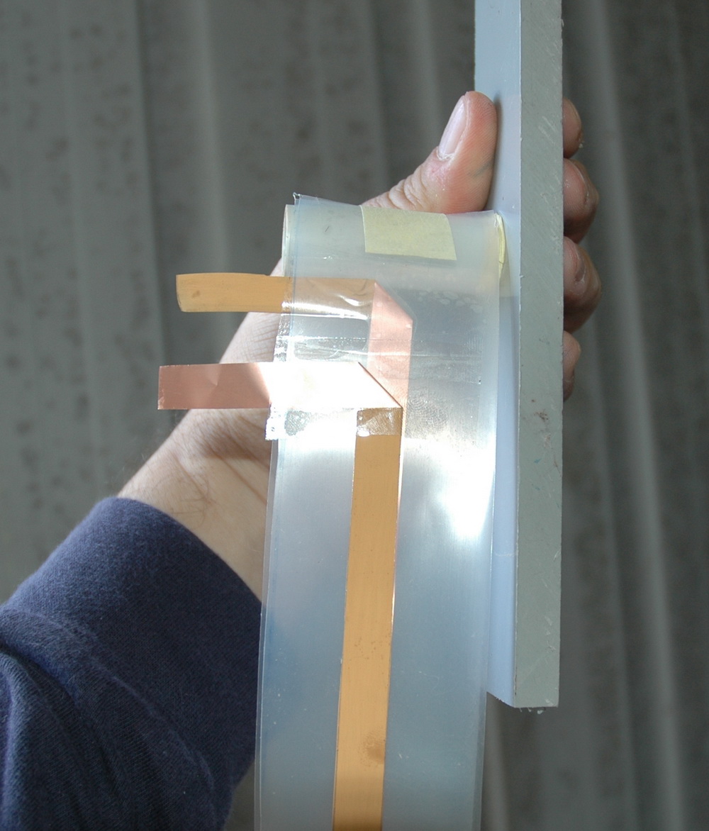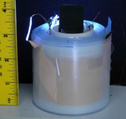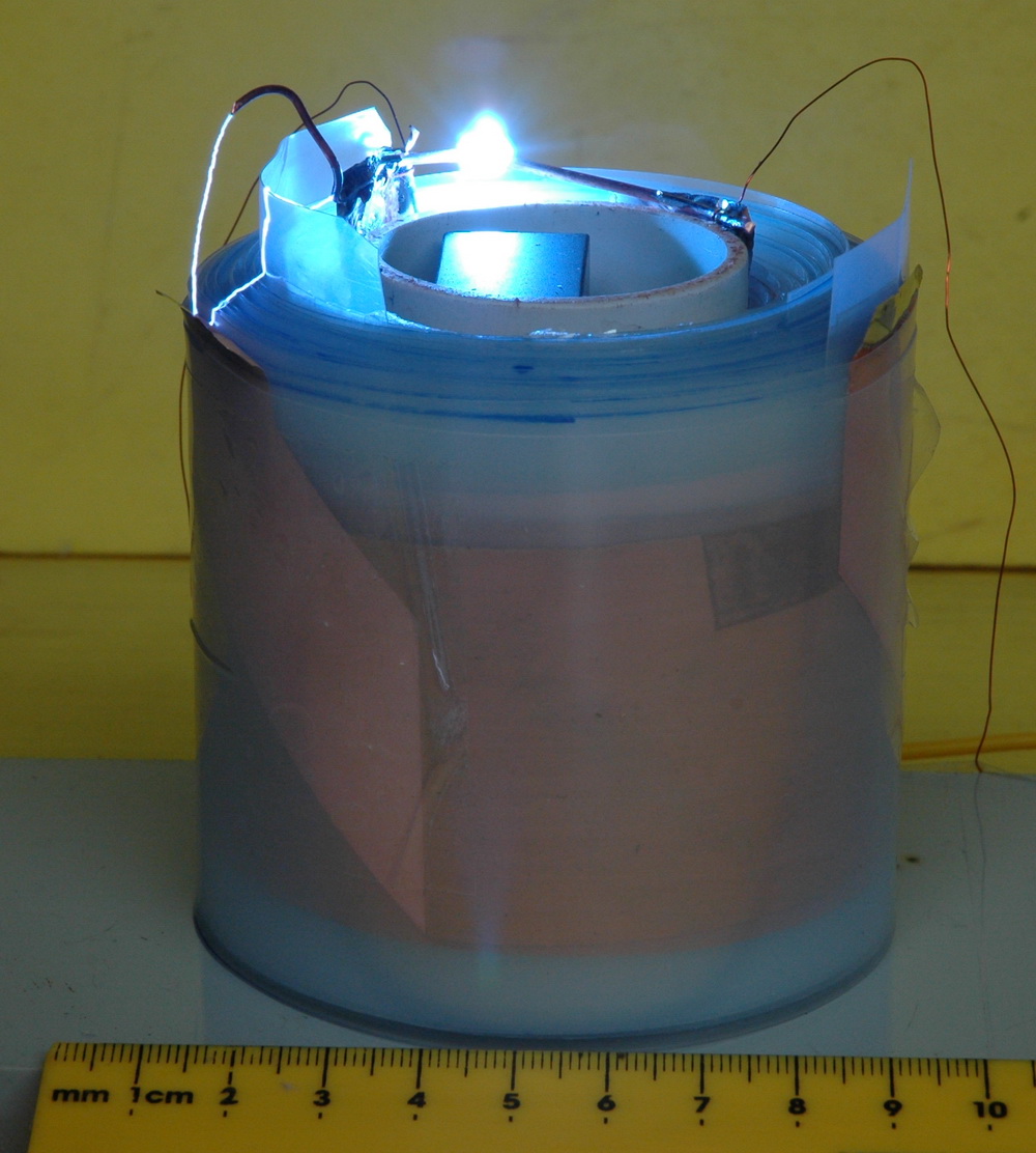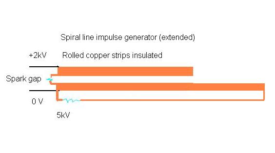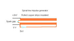 The left photo shows the spiral impulse generator generating a 5 mm spark (perhaps 5 kV) from a 1 mm spark gap. The spark gap is between the two electrodes (which are not connected to each other) and the right upper electrode is the one that continues through to the output electrode strip with the longer spark coming off it. The capacitance between the two strips is 900 pF. The right photo shows the 2 kV peak input from a small NST limited by a variac. It is half wave rectified and run through a 1 MOhm resistor. My meter reads peak voltage AC or DC as I have designed it. The left diagram shows the circuit of the basic spiral impulse generator with two copper strips with a spark gap between them. The are insulated from each other and rolled up. The right diagram shows the version I am using with extended foil. The larger version I try later has equal foils and works better for a number of reasons. The left photo shows the 1984 patent that this comes from. The center photo shows the start of the copper strip windings separated by polyethylene sheet. The right photo shows the strips of copper foil of 10 x 62 mm obtained as big sheets of 60 cm square from a craft shop. I have soldered two together for the long winding. Hence there are two parallel strips of 4.5 turns and one strip only continues on for another 4.5 turns. It doesn't seem too efficient but I don't really understand the setup enough to know which way to modify it best. I imagine that I could make one with more turns to start. The photo above shows an earlier version that didn't work other than to light a neon pilot. No real idea why, but I tried again with thinner flatter windings. Now here is a better one.