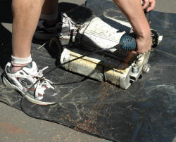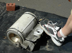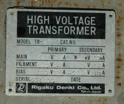 2008 At this stage I am a little unclear whether I will make it a mains frequency unit run from an x-ray transformer or a high frequency driven unit. The capacitor sizes are vastly different but I can get more convenient power from the x-ray transformer. Junkyard transformer 3 kV AC 2003 This is a 240 V / 3 kV transformer rated at 10 kVA which cost AUD$50 at a junkyard. Tested here using the most modern equipment with a draw-an-arc-off-it-and-see approach. I used the ballast as described in Scitech to limit the short circuit current to around 15 A. It takes 2 strong people to lift it, so at the moment it is stuck on top of my arc welder and 'will not be moved'. It makes a useful anvil as well.