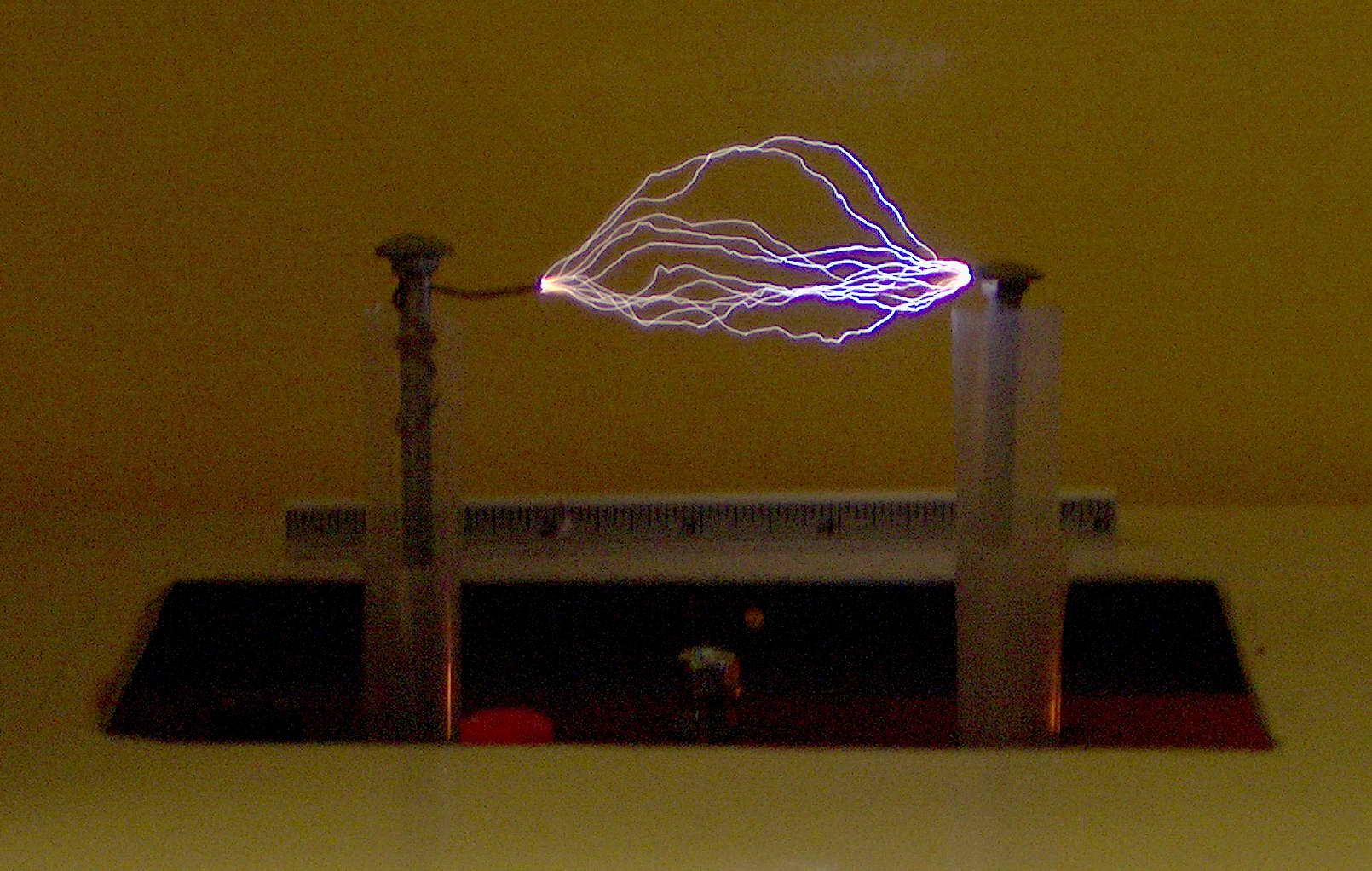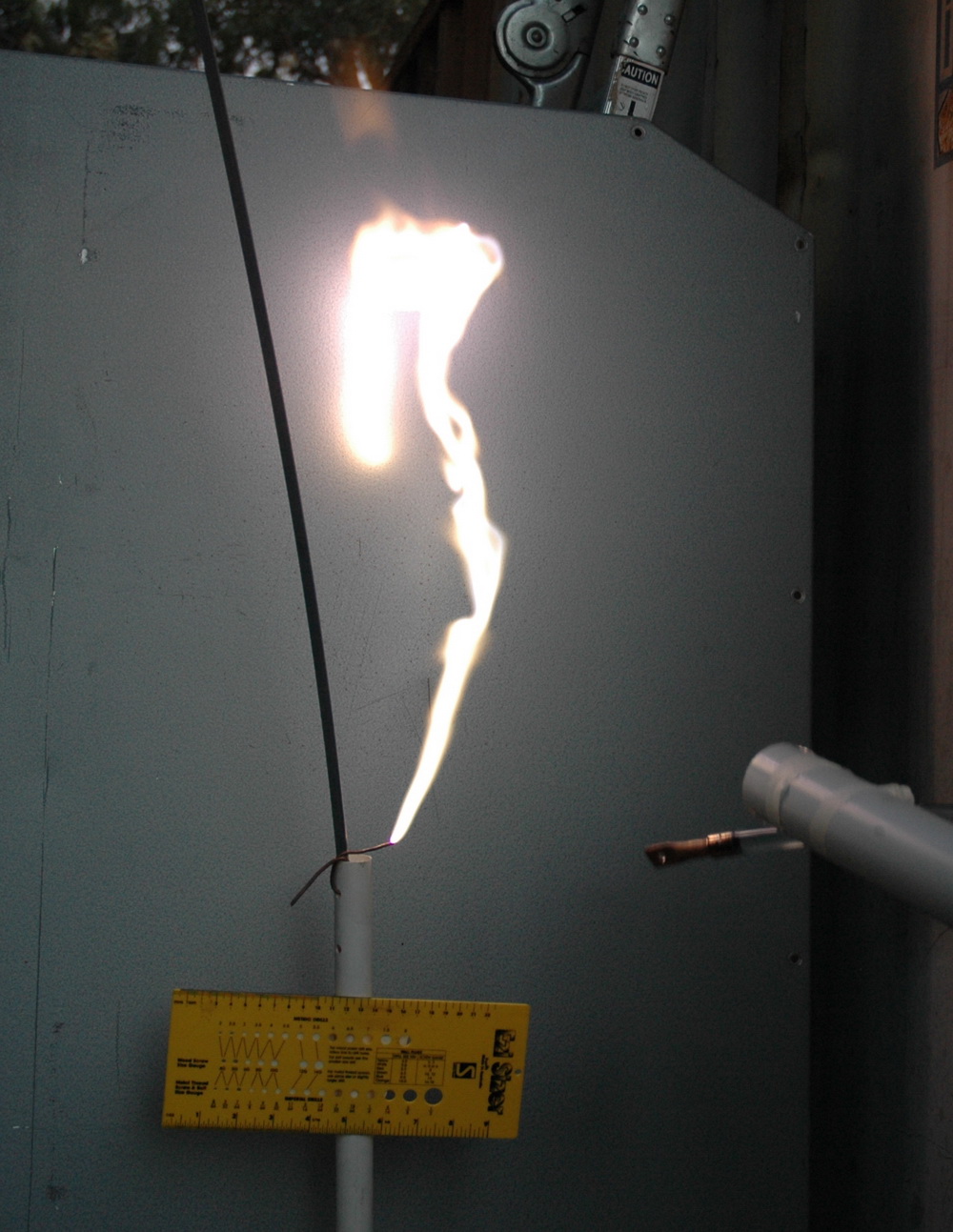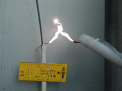 2008 Above left photo shows the transformer which has everything under oil including rectifiers. The right photo shows the face plate specifications. Above shows the series of 4 photos of the spark initially jumping just over 1 inch to my 200 kOhm water resistor for current limiting. The yellow ruler is 9 inches. The second photo shows the spark jumping to the sheet metal back that I has too close. It then began to "climb" and stretch out. This is now the full output with no resistor. It reaches it's full height at 26 inches before extinguishing like a Jacobs ladder. My wife came out to see why the power had "browned out" in the house. Input power for the spark through the resistor is 25 A measured by a clamp meter at perhaps 100V. I didn't take current measurements with the spark above but the input voltage was set on the variac at 200 V. It didn't trip a 20A breaker possibly because each run was only a couple of seconds.