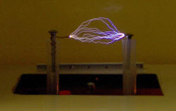 coil sparks 60 kV 2004 Alternatively one can use SIDAC's. This very simple circuit uses the transformer, capacitor and diode out of a microwave oven to supply 2000 VDC. Once the voltage rises to 2000 V the SIDAC's fire dumping the energy into two ignition coils to give sparks of easily 5 cm. I am using 9 SIDAC's each rated at 240 V 1 A RMS and 20 A pulse. Each is shunted with a 1 Mohm resistor to give more even voltage division. There is a 10 Kohm 10 W resistor used for these shots but power draw is triggering a 10A cutout and there is sufficient heating of resistor, diode and SIDAC's to only allow short runs. 50 Kohm will allow about 4 sparks per second. Unfortunately this is very hard on the ignition coil's insulation. I have lost one coil but the remaining one still puts out 3 inches and also about 10 inches of surface tracking (below).