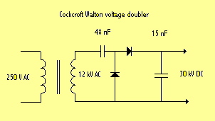 The circuit diagram is shown above. One diode was made from 3 microwave oven diodes rated around 11 kV each and the other diode from two 1N4007 (1000 PIV rating) arrays of 40 diodes each. Here is a low voltage dual 5 stage C-W multiplier which puts out 2000 VDC from 100 VAC. The current is very low at the highest voltages and even the digital multimeter drops the voltage by perhaps 10% or so.