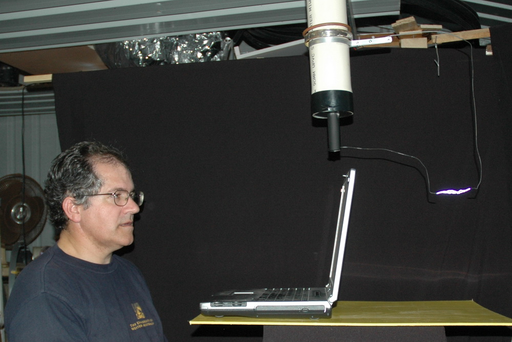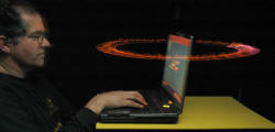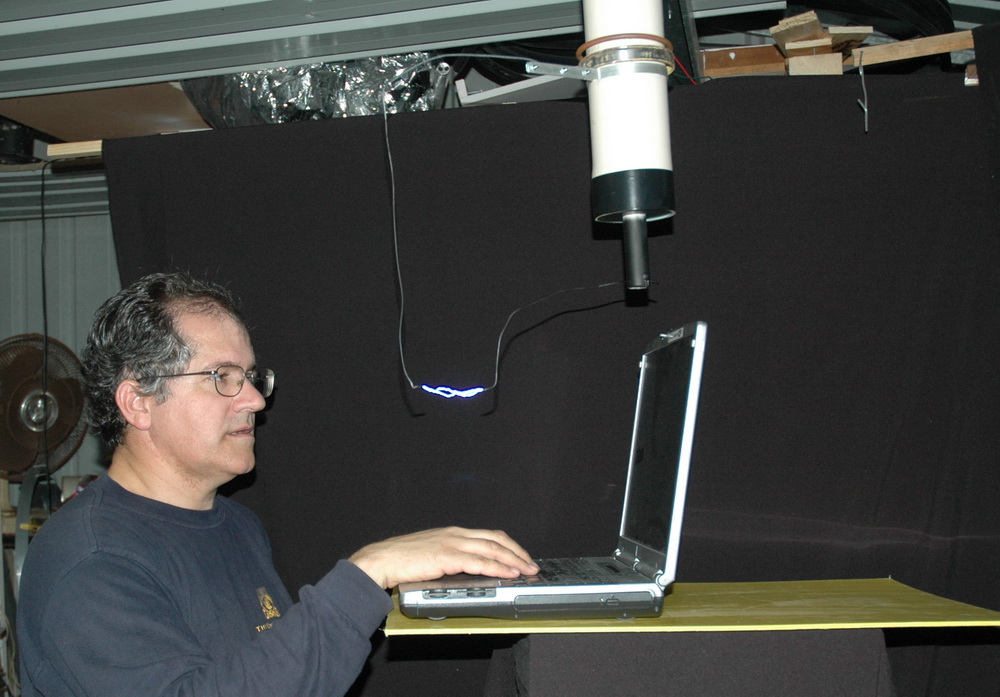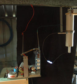 And I have other versions... The photo above shows that it also comes in a flame colored 'lite' version. The high intensity professional version is on the right. Note that as in all my photos there is no "photoshopping". The pictures are all single shots and effects are produced with long exposures. Here's how. The left photo above shows the ZVS flyback supply driving a 4 stage CW multiplier. It is capable of 5 inch sparks but shown here with half that. The center and right photos show how the rotating setup swings the sparks in a circle around the laptop but not too close to my face (just). The center terminal is earthed and is relatively safe. The 'hot' electrode is closest to my face. There is a bit of motion blur in the main photo because the sparks started just in front of my face. They are very loud and bright and it is hard not to reflexively blink and pull back a bit even when you are expecting it. Being close to DC voltages gives a spooky feeling as the ionic wind blows on you and your hairs stand on end as they charge up. As the spark moves these feelings move across your face.