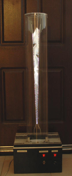 The left photo above shows the Jacob's ladder powered by my original old unpotted NST and shielded with acrylic