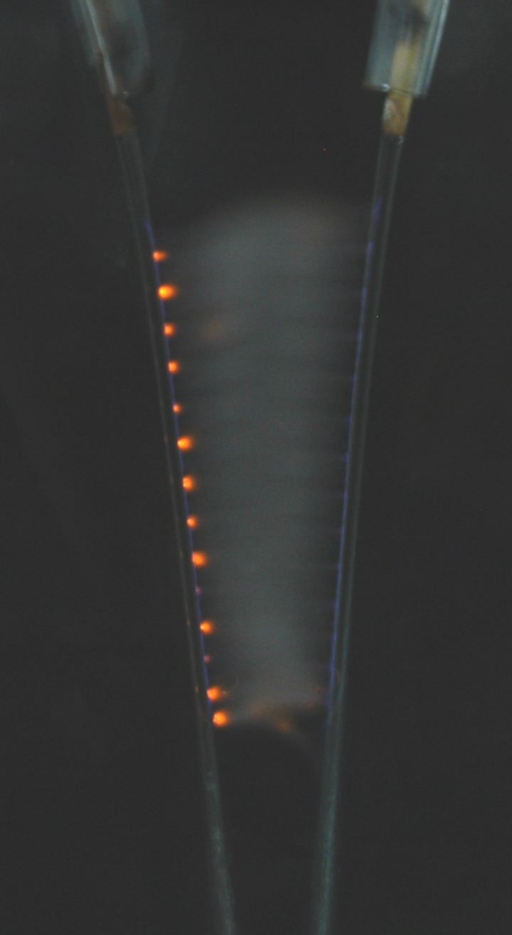 shows a the spark with seawater in the left stream and copper sulfate