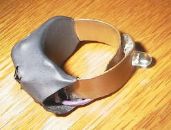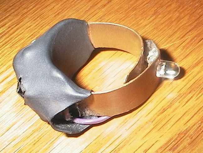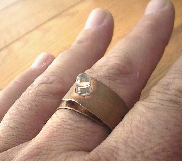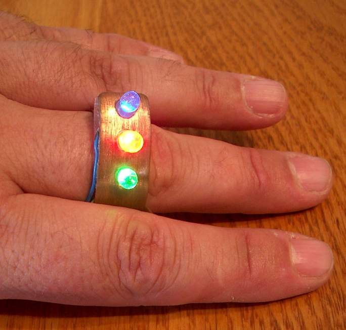 Green ring 2002 (below) uses a 6 volt miniature battery, microswitch and a 120 ohm dropping resistor. The green super high intensity Gallium Indium Nitride LED is rated at 14,000 mcd at 20 mA (= 5 mW) and is dazzling in line with its 15 degree beam. They cost A$10. The microswitch is operated by a thumb press.