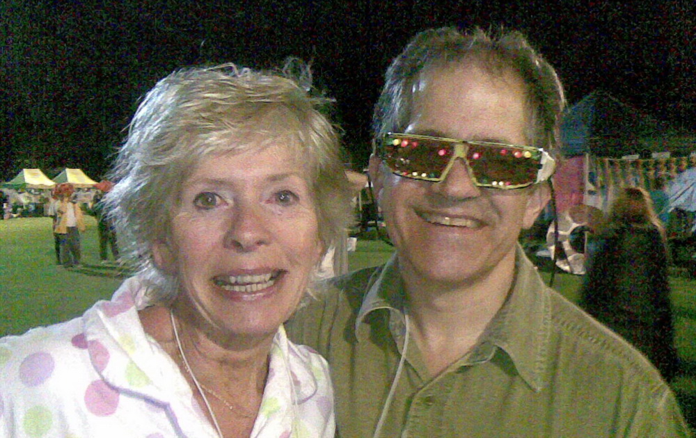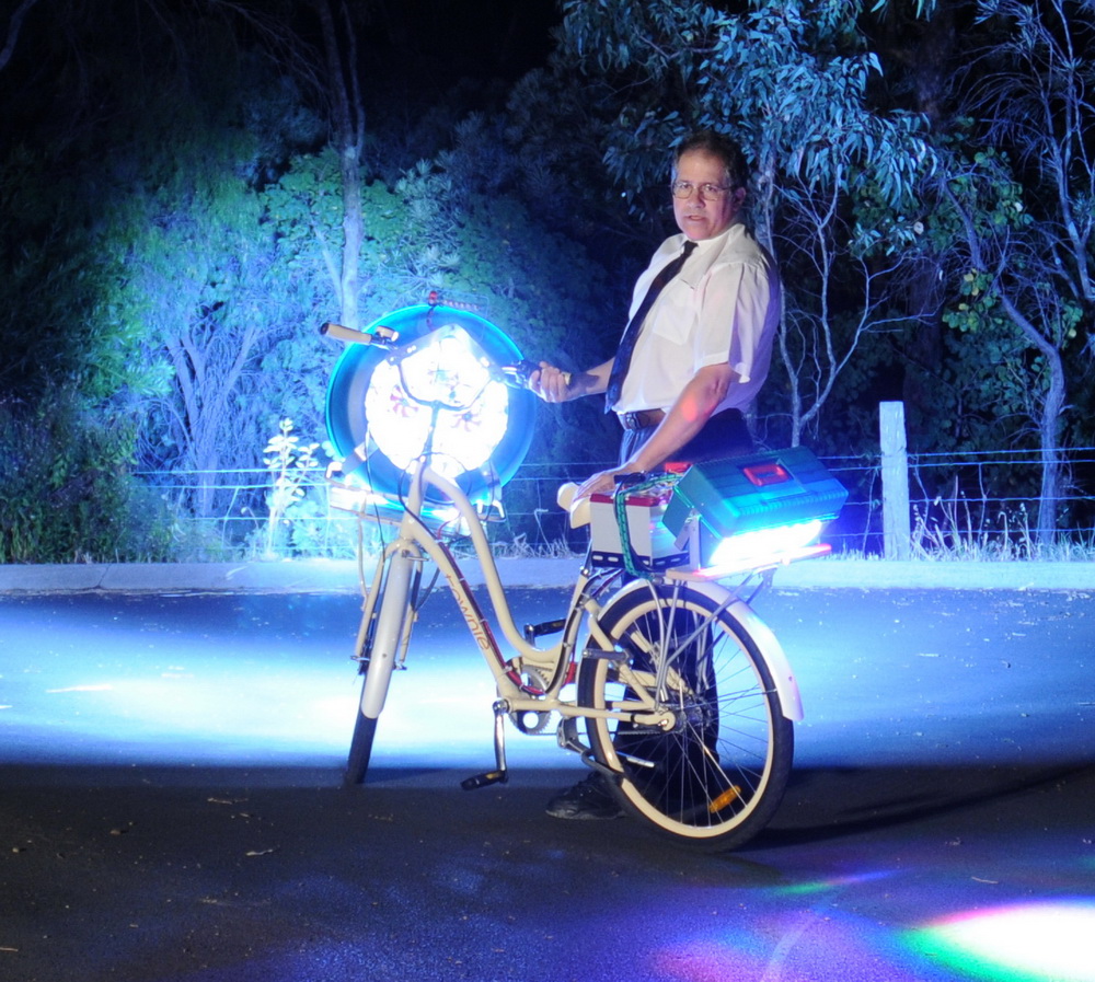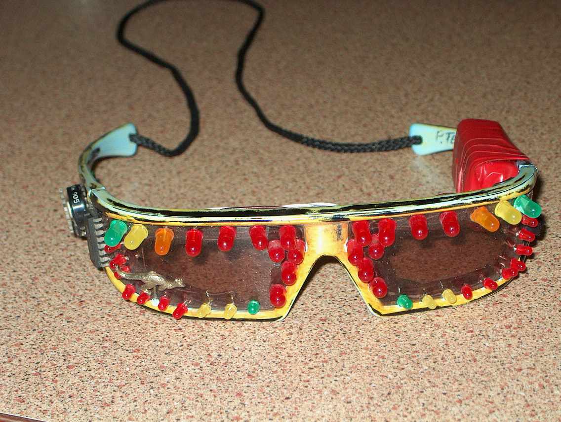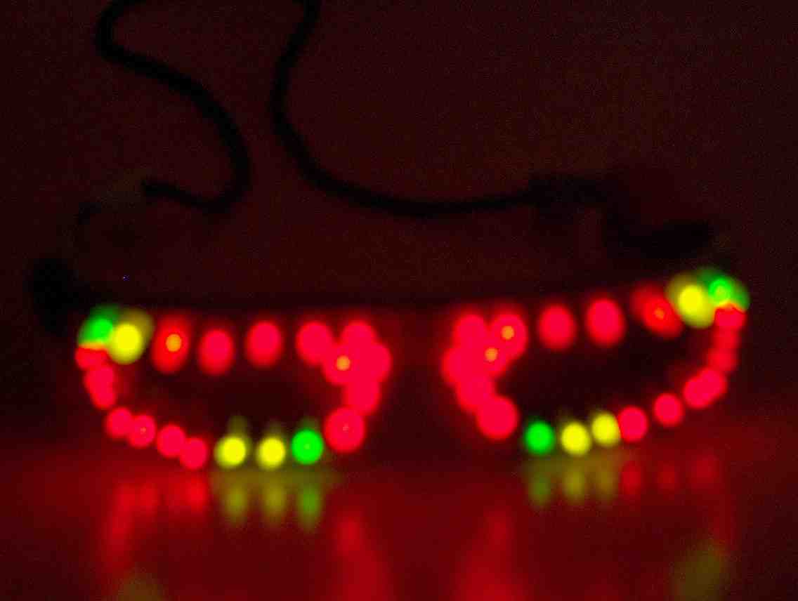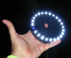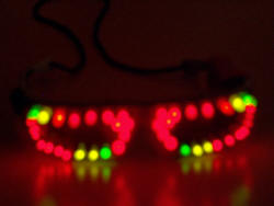 This model was made in about 1981. I think you have to be drunk or stoned to get much pleasure out of these and as I don't do either, they are only brought out on special occasions. It is interesting watching them circulate though a disco from person to person. I haven't lost them yet. They use a 555 timer driving a 4017 CMOS decade LED driver with each leg driving 4 standard low intensity LEDs (?20 mcd) with each side rotating in opposite directions and cycling through different colours. There is a speed control to go from standstill to continuously on. It takes a lot of interconnections around the frames. If I was to remake them I would use a smaller rechargeable battery and high intensity LEDs. The coloured rings are, of course, the appropriate fashion accessory for the glasses. Well, just occasionally I wear them in 2008, 27 years later like at night in this 24 hour charity relay walk. I have resisted the temptation to put in high intensity multicolor modern LEDs but maybe I'll make a new model sometime.