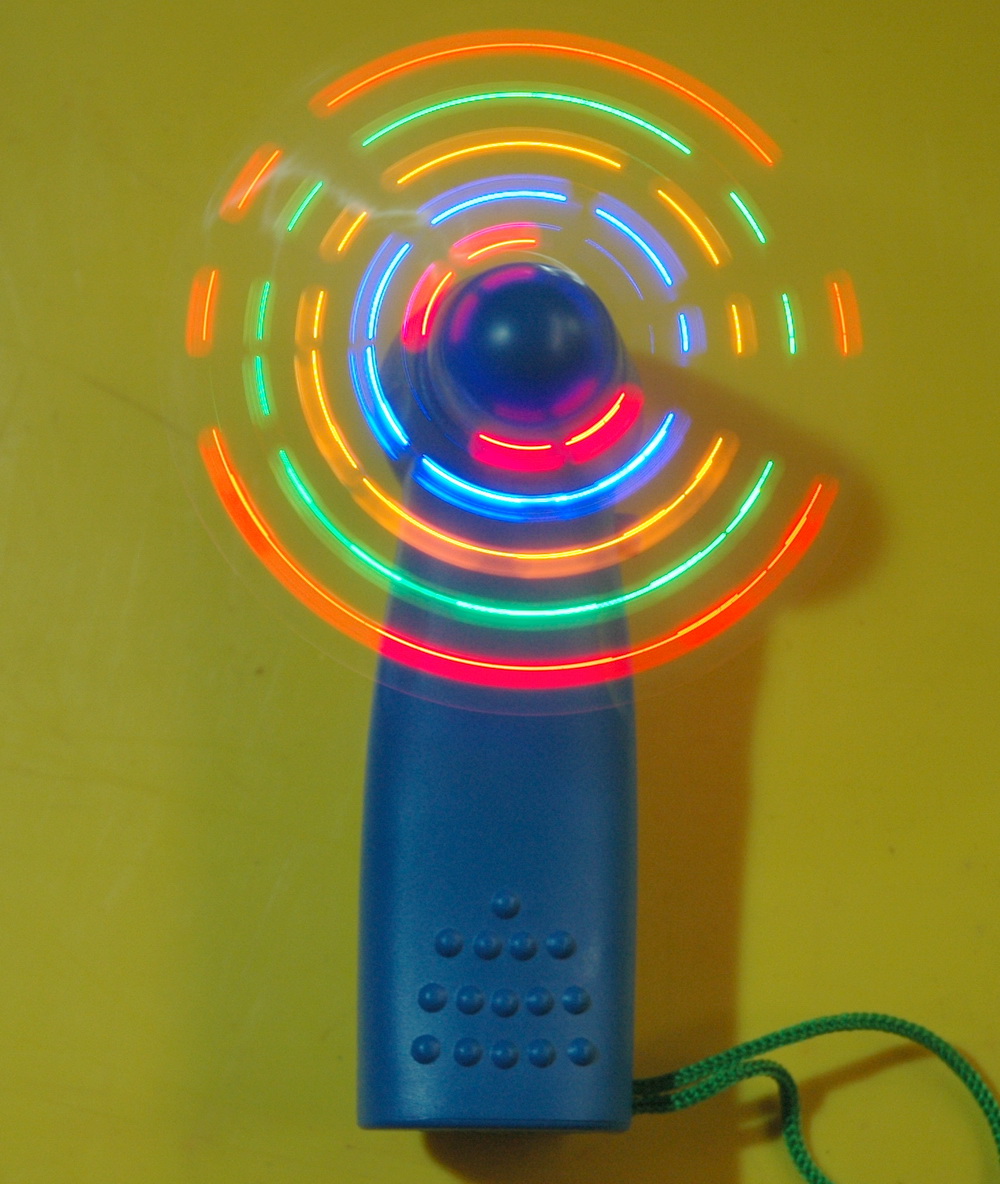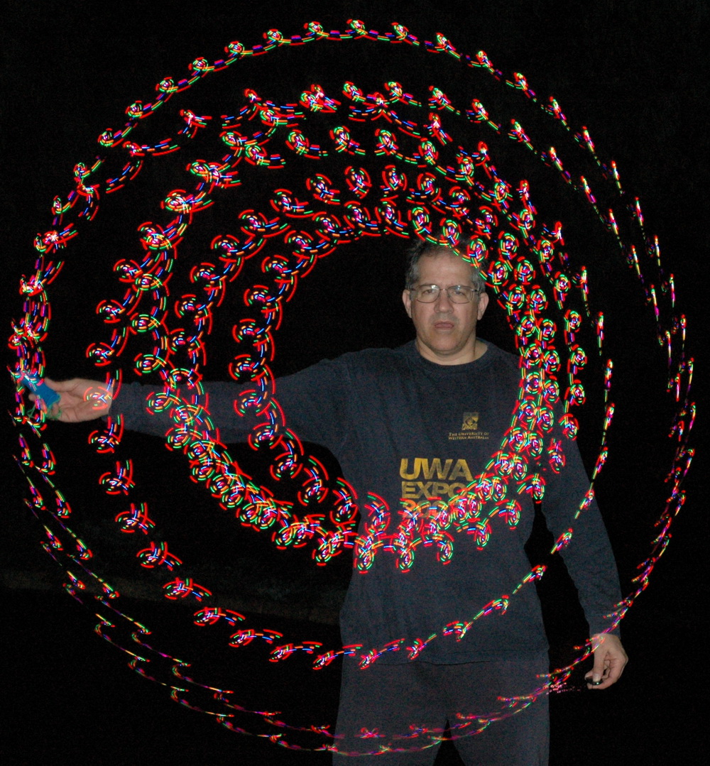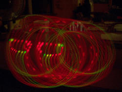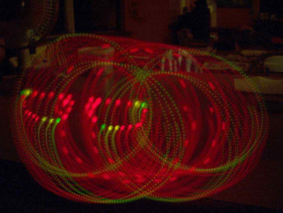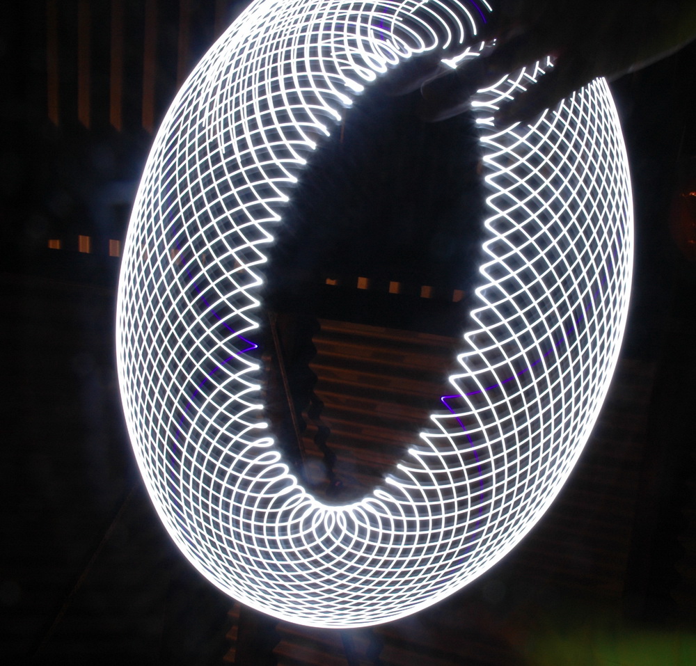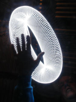 2008 Above left photo This is a small commercial battery powered LED array that my wife wanted suspended above the BBQ. I have covered one of the LEDs with blue cellophane. The right photo shows it suspended above the camera. Now just give the lights a push and take a time exposure. Above left photo Pushing the array in a simple circular motion with some spin gives intricate geometric patterns. Center photo It's like you could almost grab it. This looks very much like a toroid used on top of my Tesla coils. The right photo shows the path followed by the one blue colored LED. This next one below is a little fan with programmed LEDs in one of the soft plastic blades and was bought in Hong Kong (thanks Gail). The flash rate and sequence of each LED varies. Above left photo The fans with its 5 LEDs is stationary. The right photo shows it running and you can see the pattern which constantly changes. Left and center photos show the fan rotating spiral giving a lot of detailed patterns. Pushing the array in a simple circular motion with some spin gives intricate geometric patterns. It's like you could almost grab it. This looks very much like a toroid used on top of my Tesla coils. The right photo? Hmm.. only a mother could love a nerd like this.