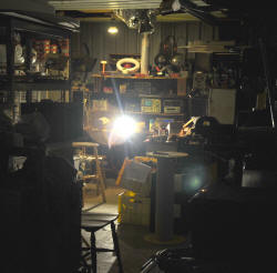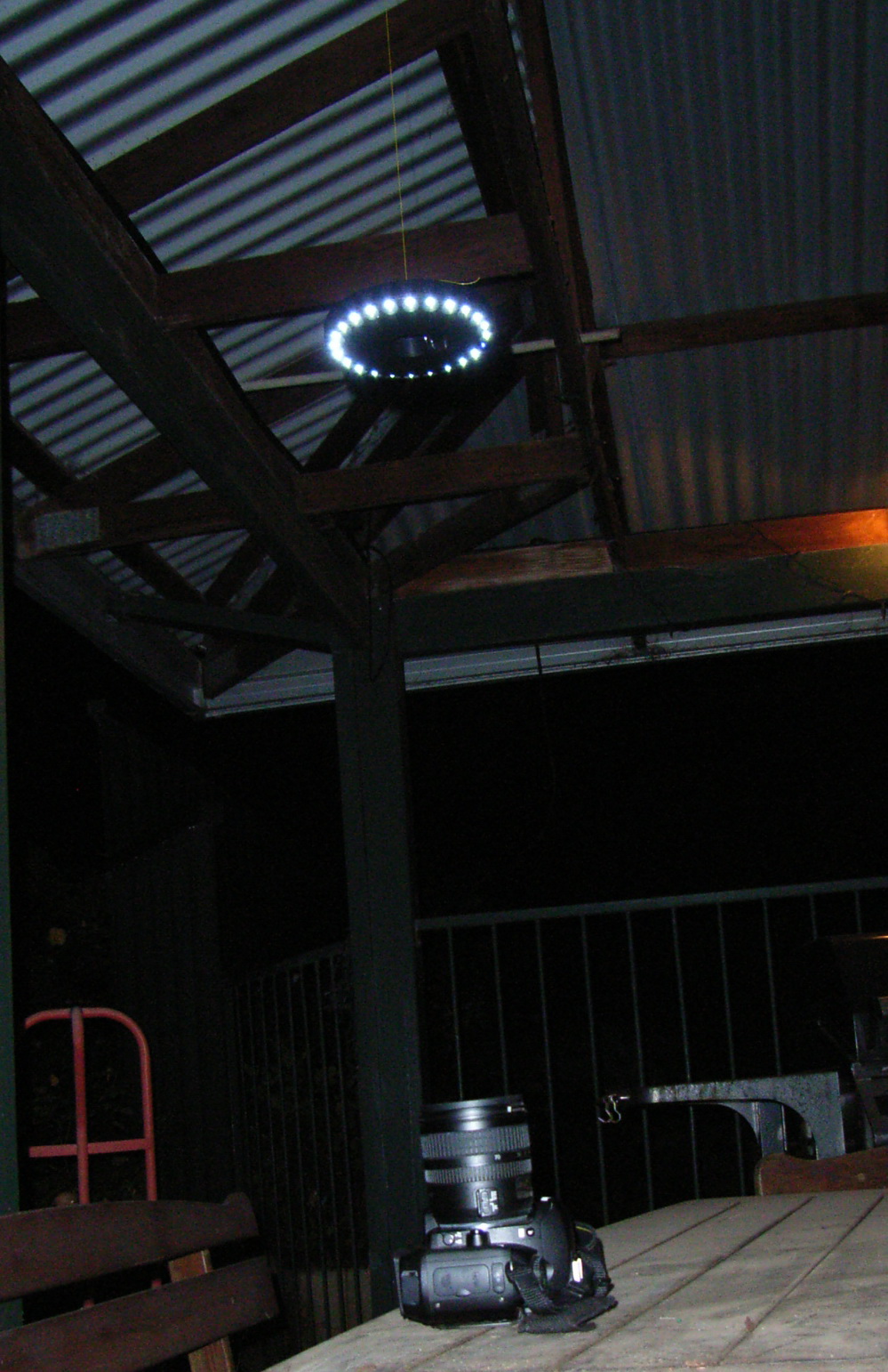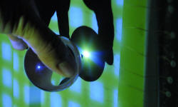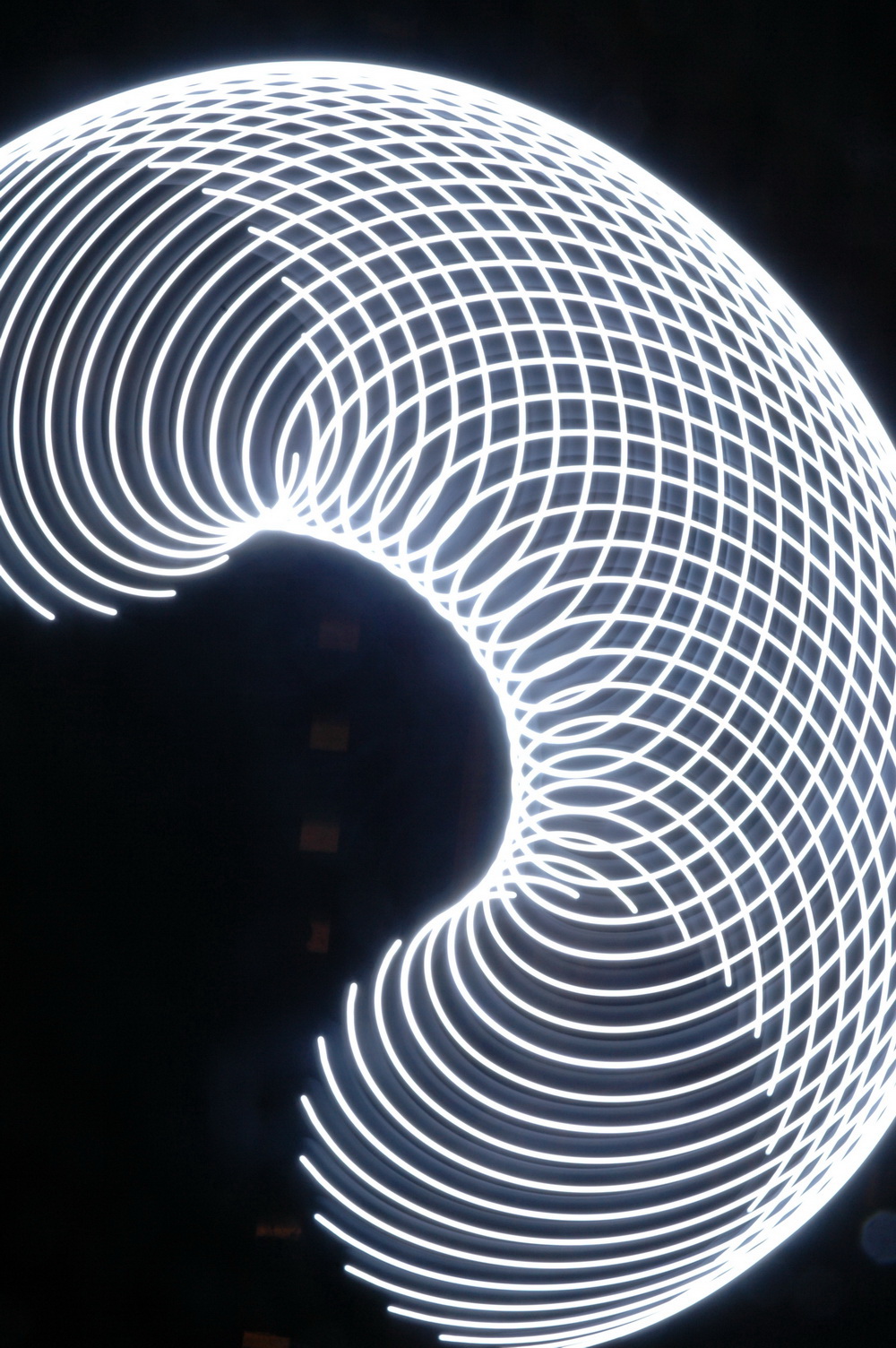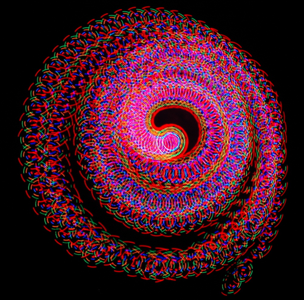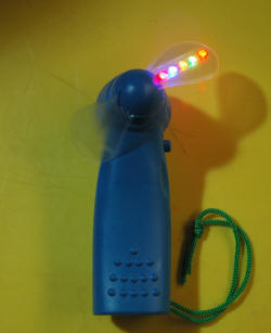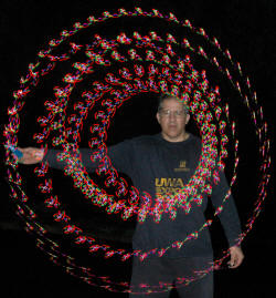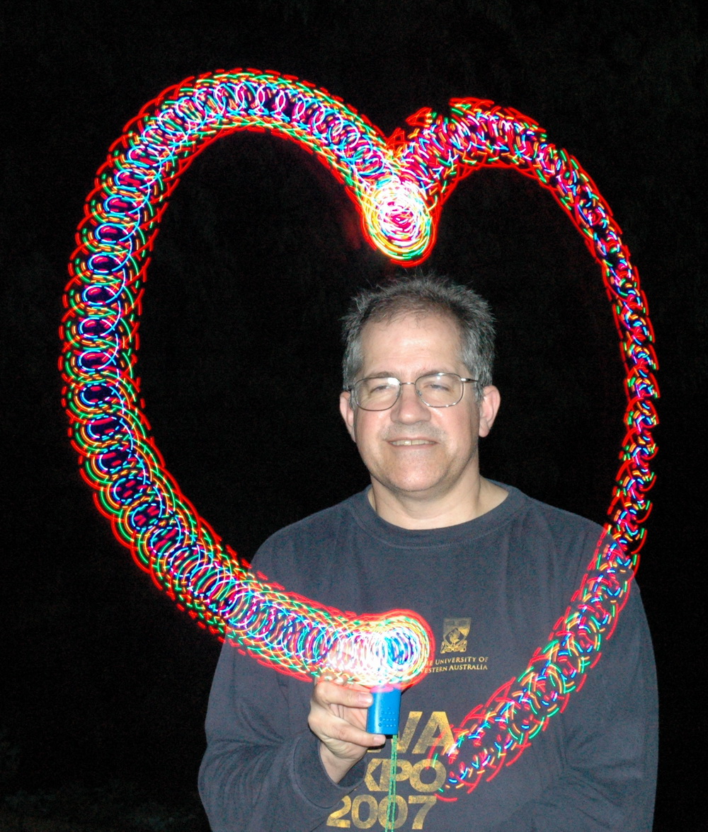 2008 Above left photo This is a small commercial battery powered LED array that my wife wanted suspended above the BBQ. I have covered one of the LEDs with blue cellophane. The right photo shows it suspended above the camera. Now just give the lights a push and take a time exposure. Above left photo Pushing the array in a simple circular motion with some spin gives intricate geometric patterns. Center photo It's like you could almost grab it. This looks very much like a toroid used on top of my Tesla coils. The right photo shows the path followed by the one blue colored LED. This next one below is a little fan with programmed LEDs in one of the soft plastic blades and was bought in Hong Kong (thanks Gail). The flash rate and sequence of each LED varies. Above left photo The fans with its 5 LEDs is stationary. The right photo shows it running and you can see the pattern which constantly changes. Left and center photos show the fan rotating spiral giving a lot of detailed patterns. Pushing the array in a simple circular motion with some spin gives intricate geometric patterns. It's like you could almost grab it. This looks very much like a toroid used on top of my Tesla coils. The right photo? Hmm.. only a mother could love a nerd like this.