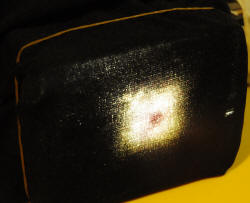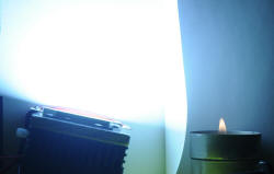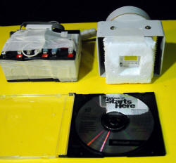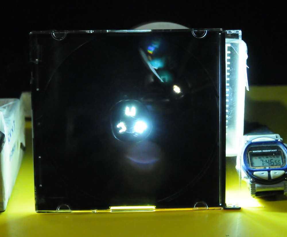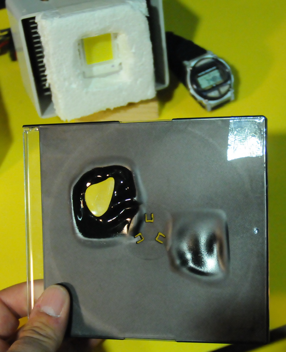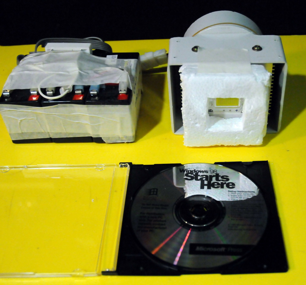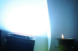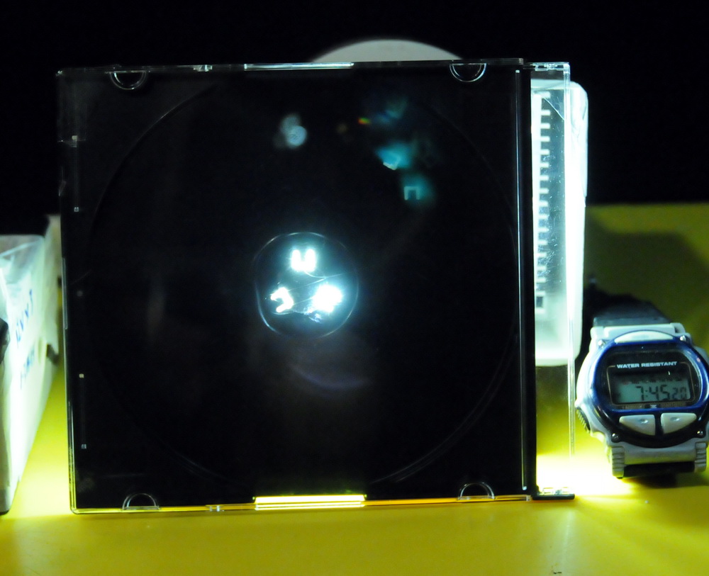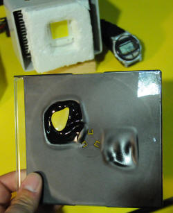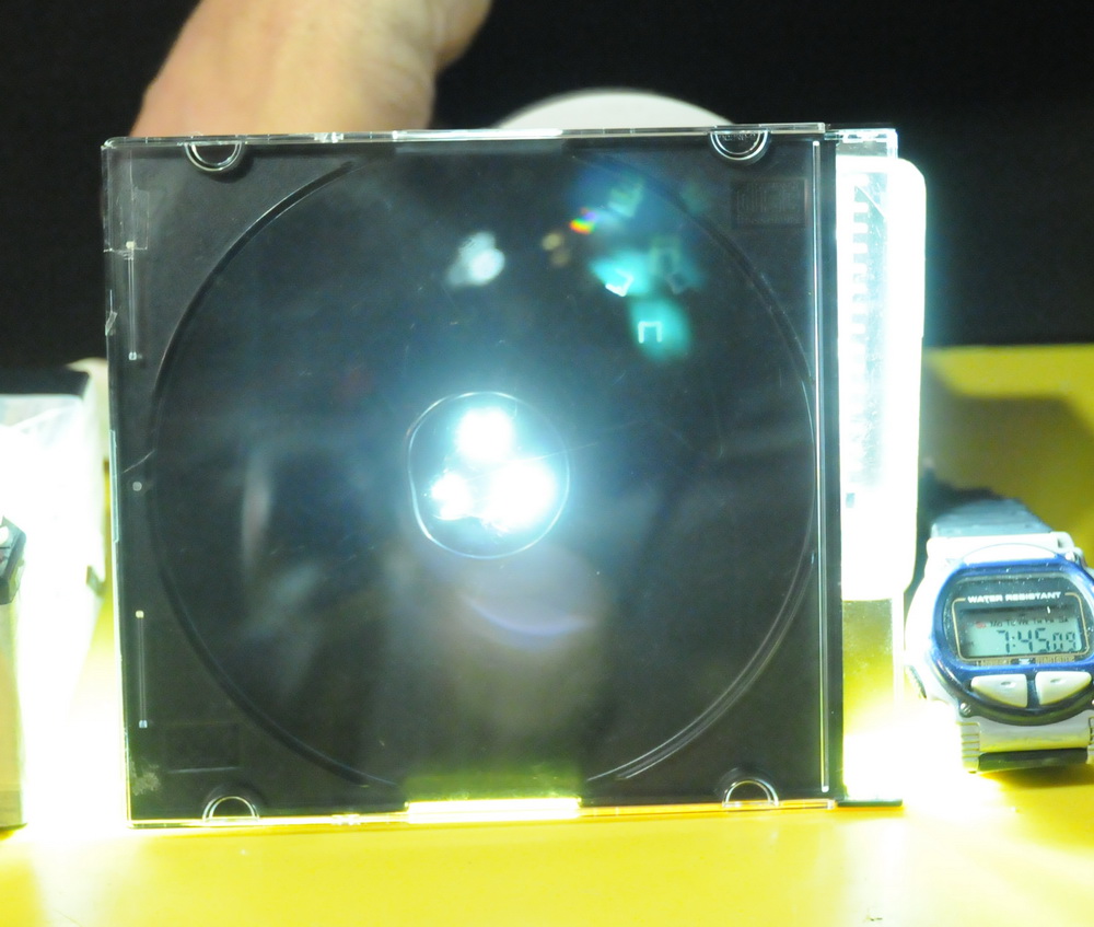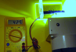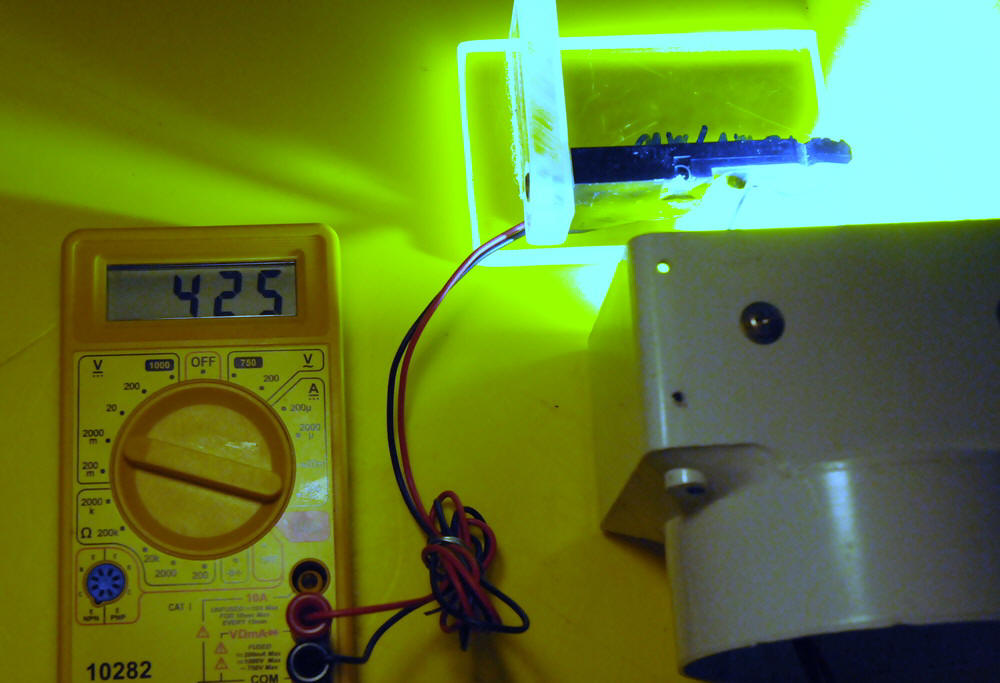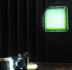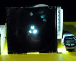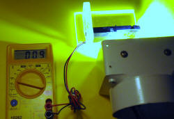 it is. It can burn things. How about burning a CD case above? Took 1:45 mins to make a hole, but my heatsink fan was also cooling the target a bit. I had to give my batteries a bit of a hand to keep up near rated power as I still don't have a proper constant current supply. To test the infrared output, I used a special infrared filter (specs here). By connecting it to my silicon photodetector cell in the center photo, I got 9 mV of infrared only output. On the right photo without the filter I get 425 mV which is total output. Hence the infrared is only 0.5 % of total output. Similar readings on an incandescent globe give about 92 % infrared. What this means is that the incandescent globe puts out much more total radiation but most of it is in the infrared. The globe radiates the heat whereas the LED puts it into a fan cooled heatsink. The 100W LED article has done reasonably well in the media. It got 100,000 hits after it was slashdotted and made it to 80 websites. These are shown on the Backwards links page - search with (control F) for 100W LED. Was popular on cycling, LED and scuba forums.