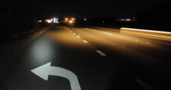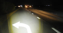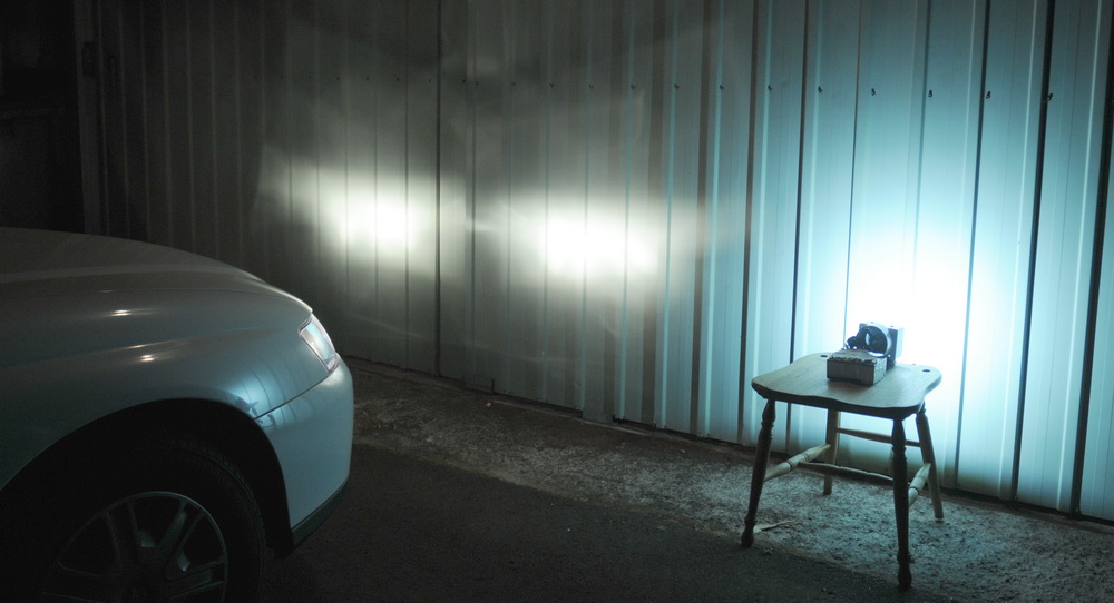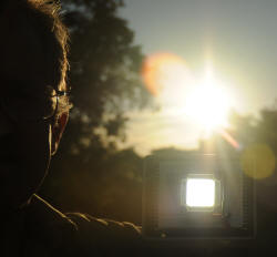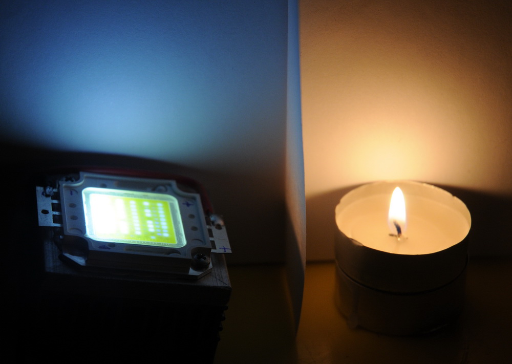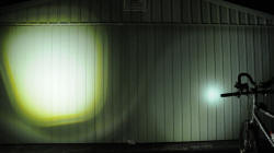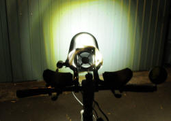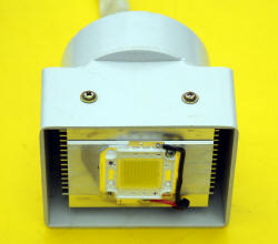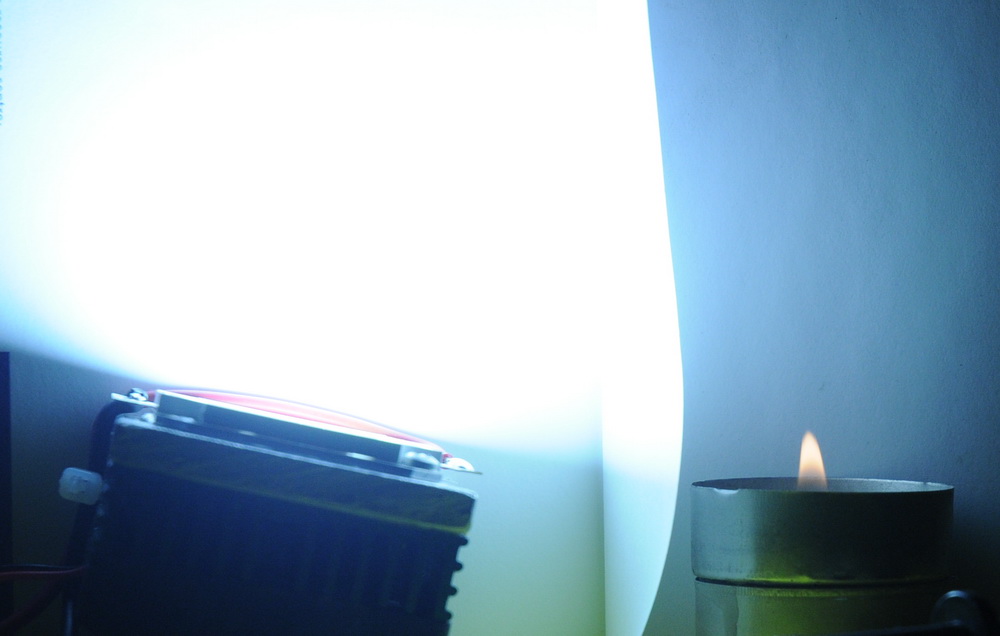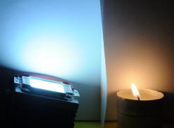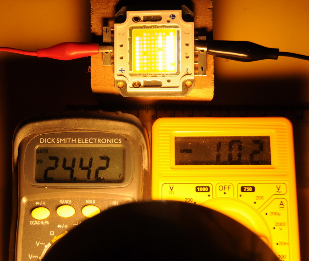 Specifications: Above shows a comparison with a standard candle at 10 mA, 100 mA, 1000 mA and 2,700 mA. Painfully bright and swamps the candle for photographic reference. The left photo above shows my shed lit with the LED plus a 150 W incandescent globe for comparison. The right photo shows it held up to the sun. These LEDs are designed for street lighting. Many US cities including LA and NY are doing feasibility studies on replacing their 100,000 plus streetlights. These would replace low or high pressure sodium lights or metal halides. Low pressure sodium is unpleasant because of the monochromatic yellow but very efficient. High pressure sodium is more white but less efficient. Some comparative information on luminous efficacy is here. LEDs are about as efficient but have lower maintenance. There are other advantages in smaller packaging and better beam direction to reduce wastage. For example there are different beams for a street than an intersection or junction. All this does stack the data in favour of the LED. Cost being the main difference. A range of streetlights is here up to arrays of 200 W. Different colors up to 500W here with 20,000 lumens. And cheaper 100W LEDs at $118 here. I built it up into PVC tubing (above) with a rectangular connection that just nicely fitted the heatsink/fan. I used a CPU fan of medium size as the last one was nowhere near good enough. This one seems to keep the temp down to perhaps 42 C. I was making the black housing to accommodate 3 SLA 12 batteries. Then I thought it might look interesting as a mechanical arm attachment vaguely reminiscent of Iron man or one of the Transformers (robots). You can see how bright it is in sunlight on my arm. I was rushing to finish this portable full power version by Earth Hour so I could turn off the lights (briefly) while I had a group of photographers here during a Tesla session. The left photo above is the LED on the left in comparison with a 500 W halogen floodlight on the right. Beam coverage is similar or better and it looks brighter to me particularly when you look at the shadows. LED is running on the battery pack at perhaps 75 W. The right photo shows the LED in comparison with car headlights on high beam (100 W halogens each). Beams are very different but LED is easily brighter. Above is the LED shining through a 180mm camera lens which projects a very clear image onto the corrugated shed wall. You can see great detail with the 30 times magnification including the bonding wires and chip details. One can even pick out the light from a single segment with an additional lens like this "crystal ball". Above is the LED on the left It so happens that the chip light is in a "3" shape brought out with contrast adjustment. One of the individual LEDs is marginally brighter or in better focus and stands out unusually. Above is the LED with a focusing lens. I have played with a lot of random lenses, spherical mirrors, Fresnel lenses and glass spheres out of my optics box but have no idea what I am doing. The best performance was with a magnifier used for looking at skin lesions and I have bolted this to the LED. It is close and broad enough to capture a reasonable proportion of the light output as given by the light output curves. Above is the LED on my bike with the focusing lens. It makes my very adequate 3 W LED bike headlight look rather puny. It's like having a new weapon on your space fighter. Now, let's go and use it irresponsibly... Above, left, is the normal 3 W LED on my bike with the lights of a passing car just as it is about to pass me. Then the same with the 100 W LED. Now, how about burning some stuff?