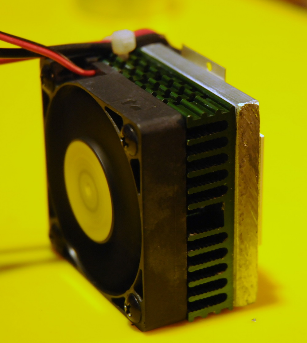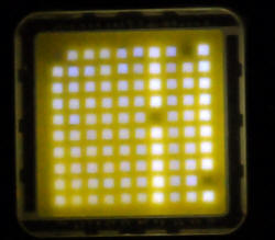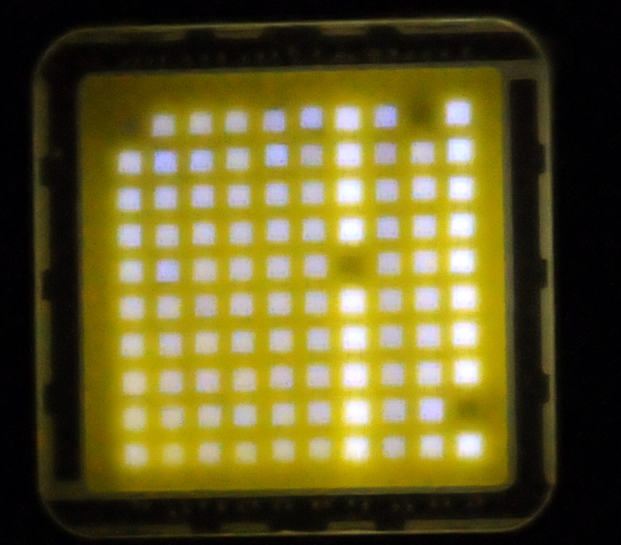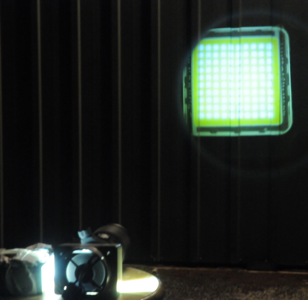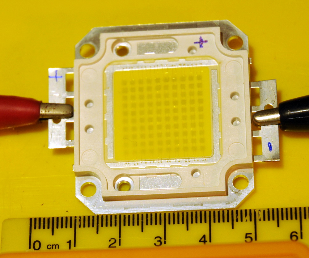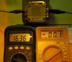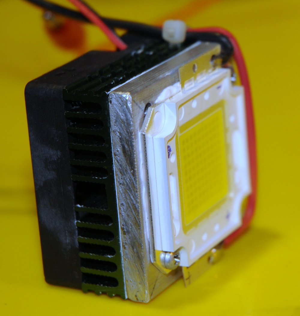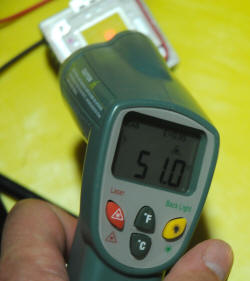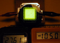 If you look closely, you can see the bonding wires for each row of 10 LEDs. So lets turn it on and increase the power slowly. This is a series showing increasing current from 0.1 uA, 1 uA, 1 mA, 100 mA in turn. Voltages range from 16.36 V up to 27.61 V. The first pic is a long exposure of 19 seconds and the last pic is covered by dark glass from welding goggles and is 1/160th sec. Note the uneven lighting of the different LEDs on the left at 10 mA. I was particularly worried about the row where the rest of the LEDs are brighter suggesting the dead segment is a short circuit. At a higher current of 100 mA, however, all segments lit equally. I was worried for a while. Above shows a small CPU heatsink bolted to the back of the LED. Last photo shows my infrared thermometer after a short run with the small heatsink. It is rated at up to 80 C operating.