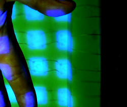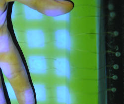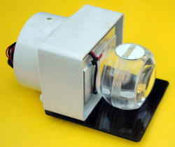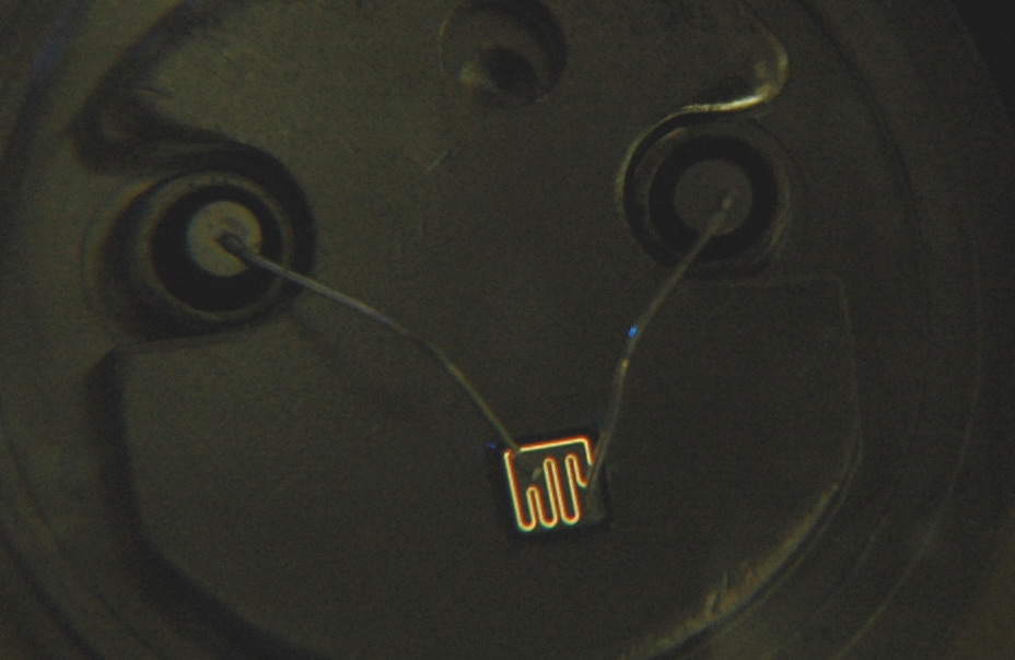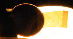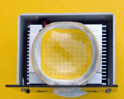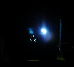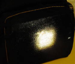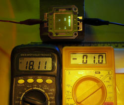 Power transistor as a LED 2006 This unusual effect shows how a current between base and emitter makes a semiconductor junction emit light. To show this one needs to expose the silicon chip in a NPN power transistor such as a 2N3055. With the 2N3055 base negative and emitter positive 11.4 V current 400 mA are drawn and the junction lights up. The chip is 2 mm wide. Camera has 2 sec exposure in darkened room with a plastic magnifying lens. |