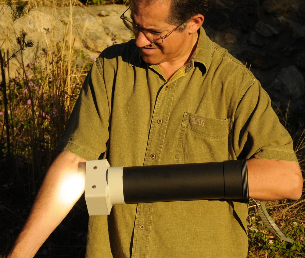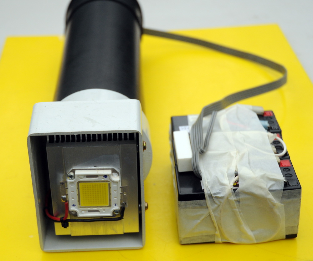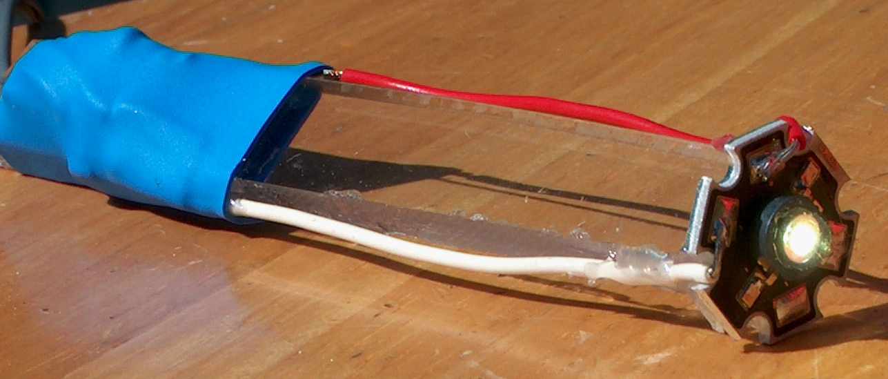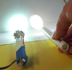1 W white LED 2004. This LED (Luxeon Star) is 180,000 mcd and draws 1 watt (350 mA at 3.4 V) and was claimed to be the worlds brightest series of LEDs in 2003. Since then 5 W LEDs are available (and of course, now that it 2011, the 100 W LED at the top of this page). It has a heat sink and a separate collimator for a 10 degree beam. It cost AUD$36 on eBay. Shown below after I mounted it on some acrylic with a voltage regulator in the handle. The brightness comparison with a pencil torch is dramatic and is over 10 times brighter than the LEDs above. It came with its specifications on a floppy disk.