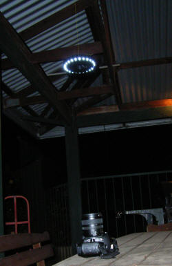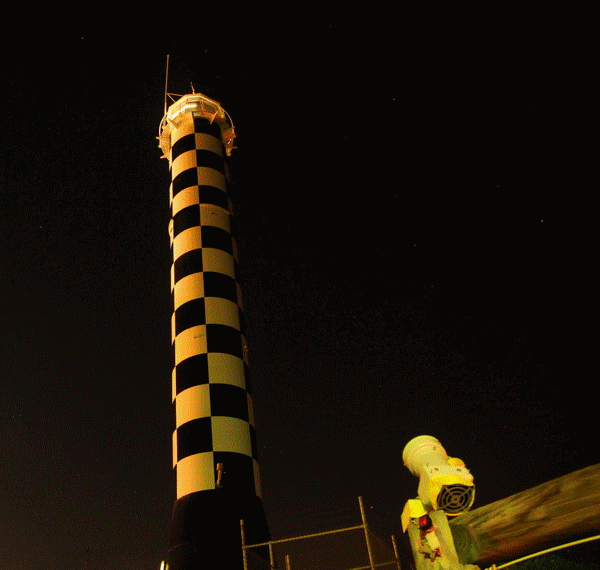 Lighting a lighthouse! This is a hugely powerful LED made from a 100 x 1W LEDs. It cost AUD$500 from China (in 2009) on an eBay store here. It produces 7000 lumens and runs on 34 V 3.2 A. It needs to have a heatsink capable of perhaps 90W. The Bunbury lighthouse is on but you cant see it's beams easily in the photo from this angle. The 100W LED runs on three 1.3 AH, 12 V SLA batteries attached to the LED which is resting on on the wooden fence here. It is fan cooled and runs around 3 A 34 V via a 0.4 ohm resistor, if I recall.