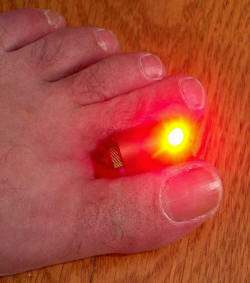 This was a bit of silliness as a one off for a "sock hop' dance to give my toe tapping some visual impact. The red Aluminium Gallium Indium Phosphide LED is rated at 8,000 mcd and is visible through a light pair of socks. It is flashed with a microswitch as your foot hits the ground.
