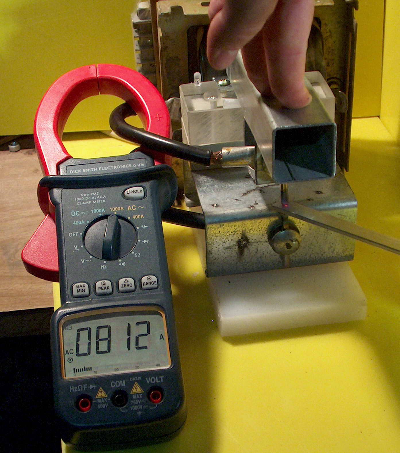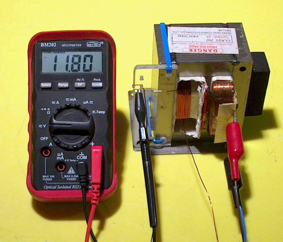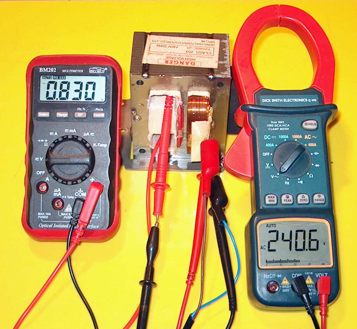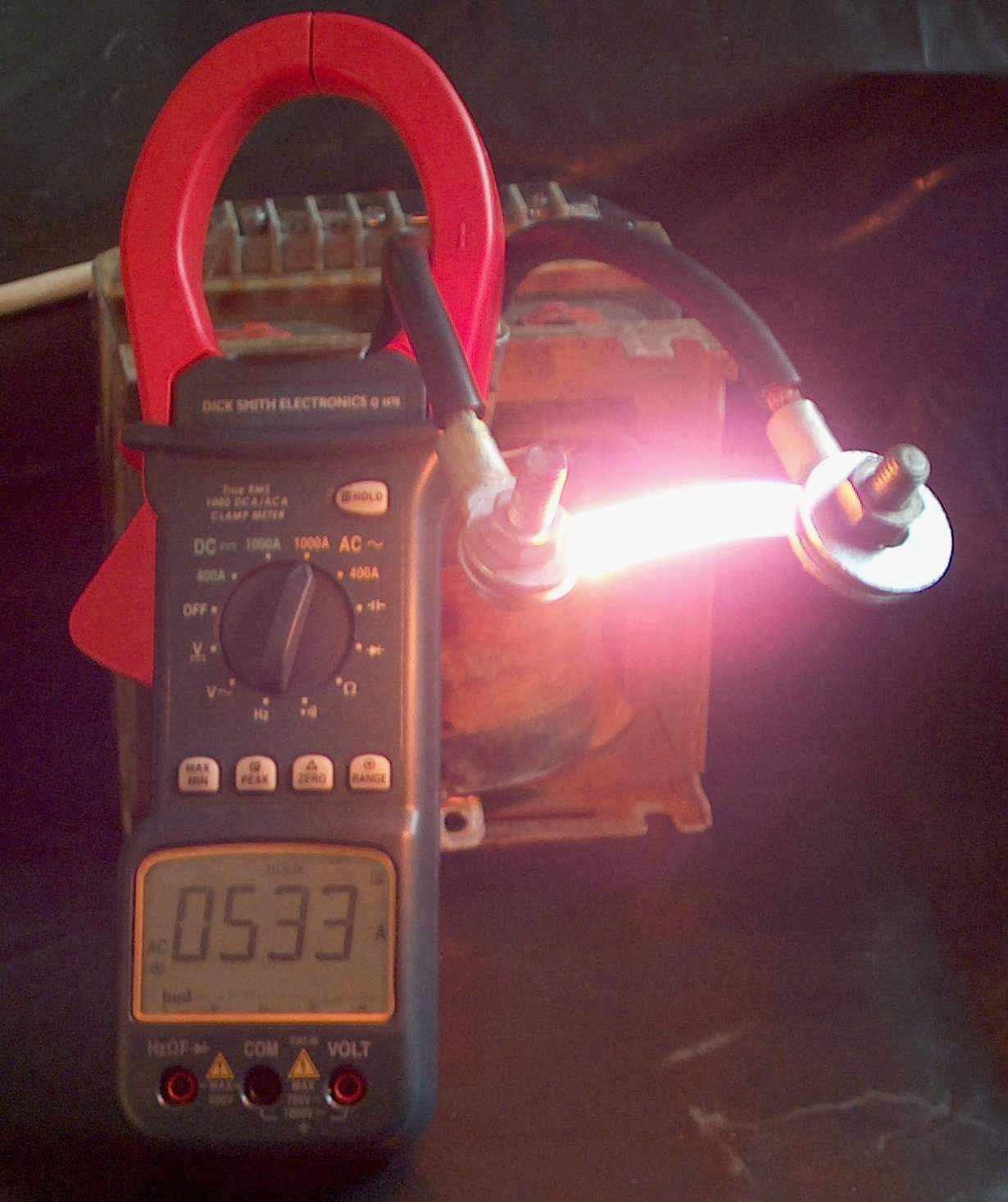 Check out the 533 A current on the clamp meter from this transformer (above). The secondary is wound with 12 mm by 3 mm rectangular wire and is rated at 6 V 90 A. Seen here heating an iron strip from a transformer lamination with about 1.1 volts across the two bolts = 600 W. At this current it will melt if left on for more than a few seconds for the picture. Short circuit current is around 830 A plus. This was another of my junkyard cheapo transformers for around AUD$20.