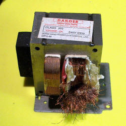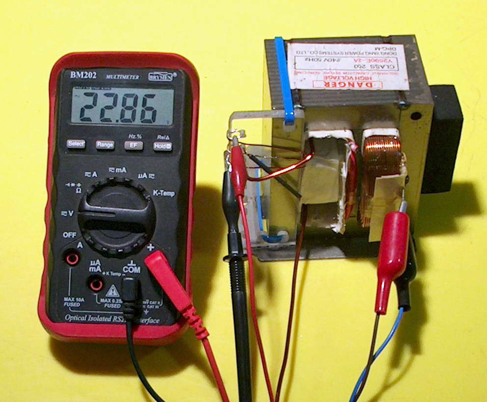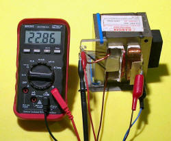 Low voltage supply using a MO 2005 Left photo shows removing the HV windings the hard way. Usually easiest to hacksaw off the winding flush then use a block of wood and hammer them out. Can't be done easily with this vertical winding style however. Middle photo shows the 0.83 volts AC (RMS) for a single turn at the rated 240 V AC input. Right photo shows 13 turns being one side of a centre-tapped winding. This gives 11.8 V AC which will be 23.6 V AC which after the diode bridge rectifier will be 23.6 * (sqrt 2) = 33.6 volts. This will be reduced by the voltage drop of the rectifier to about 32 V DC peak. Left photo shows the full 26 turns centre-tapped giving 22.86 V which is a little different to the 23.6 above due to slightly different input voltage. Right photo shows the addition of heavy gauge windings of 4 + 4 + 7 windings in series to give 12.72 V AC. This allows the many AC voltage combinations from 3.3 V to 35 V. Arranging selection of these is now the consideration, along with a range of DC voltages at an appropriate cost i.e. nearly zero.