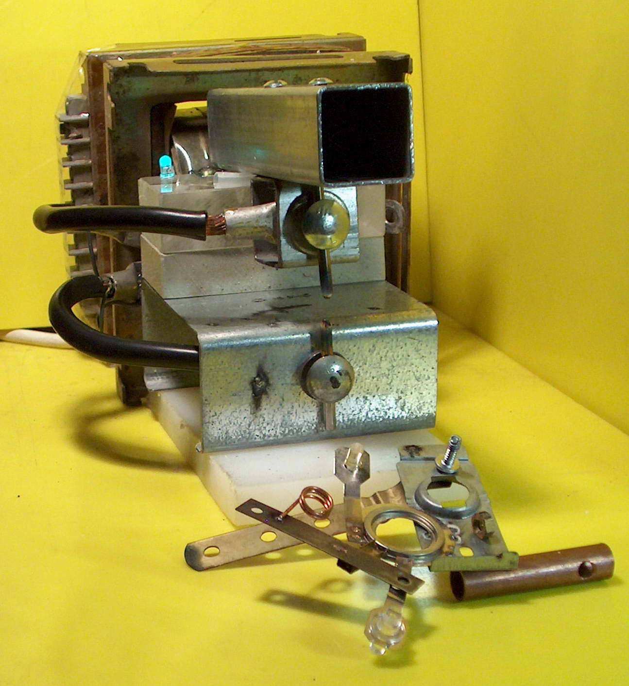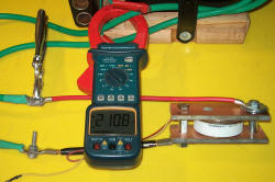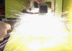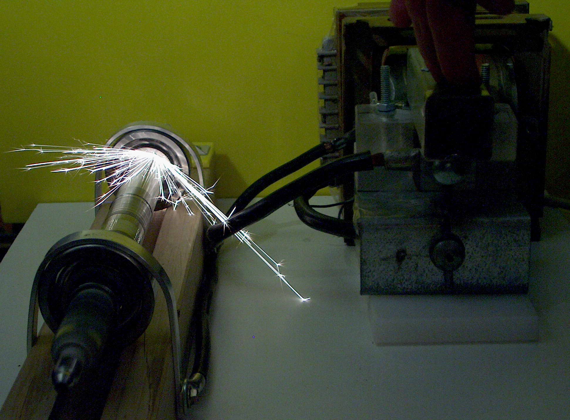 The left photo shows the hinged arm which allows two tungsten electrodes to come together. I also shows various bits of metal joined with this (very 'art nouveau'). The middle photo shows the flash if there is a poor contact. The right photo shows a good contact and 812 amps flowing. About 1-2 seconds later the tungsten rod was red hot. The 8 mm black cables get hot even with a few shots.