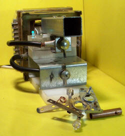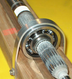 2005 The left photo shows it running at 1223 RPM at 165 A but the flash has stopped the motion. The centre photo is a close up of the bearing. The right photo shows it running at higher power on AC this time from my 6 V 90 A transformer ($20 junkyard find) which I have added to my spotwelder setup which happens to work fine as a high current switch. With the AC the current is 365 A and peak RPM 2016 before thing start sparking, overheating and slowing after only 5 or 10 seconds. Even the heavy black cables 6 and 8 mm get warm. This is a video showing the motor running underwater (1Meg). It runs slower as expected but still runs. You can see the tungsten switch electrodes glowing red as well.