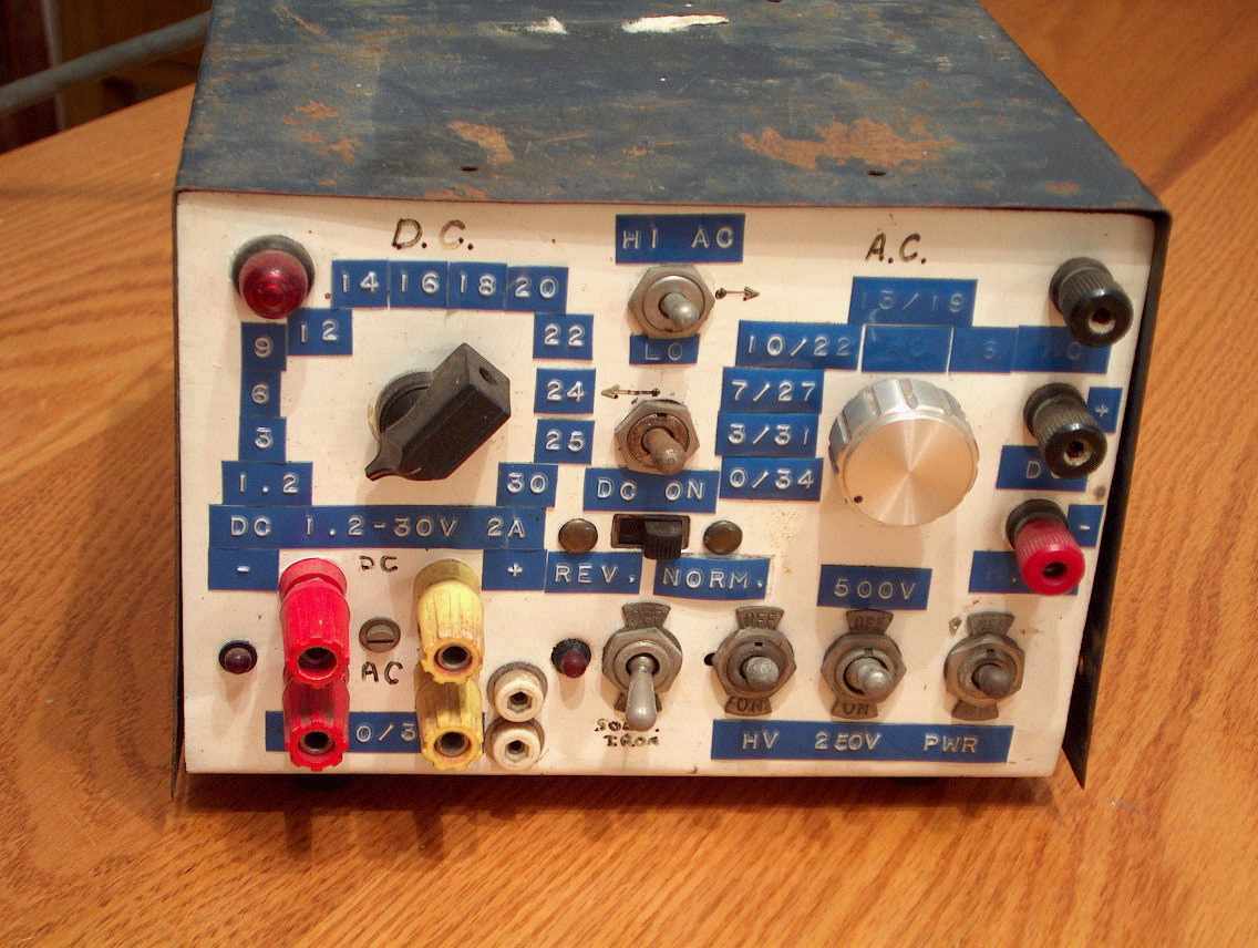 My sentimental favourite power supply was made in 1971 and was developed over the years. It appeared in the local newspapers 8 times as a backdrop to photos about two of four state wide talent quest prizes I won between 1970 and 1973. Currently (no pun intended) it is defunct but previously supplied 1-30 V DC at 1 A with a LM317 regulator, and a range of AC voltages from 3 V to 500 V.