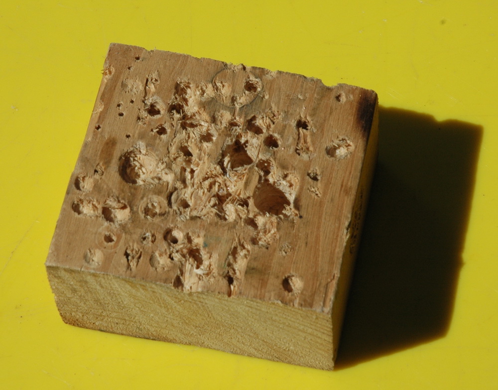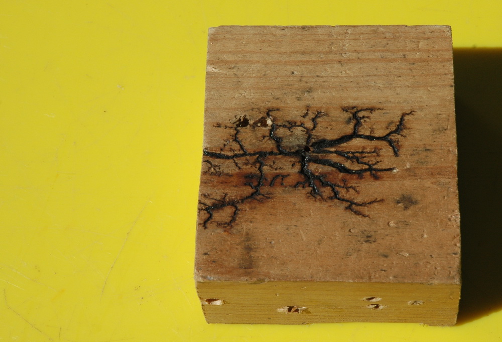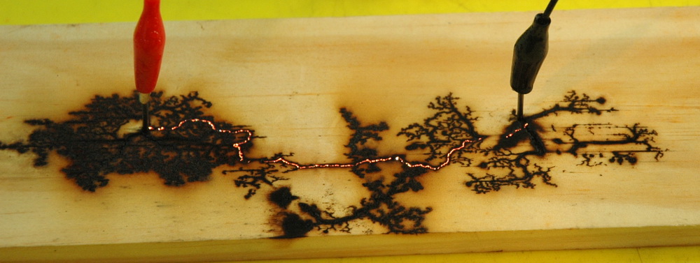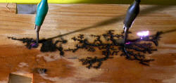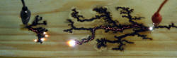 Here is what happens when you put a few kV between two nails in some wet pine. I have adjusted the voltage between 2 to 10 kV from my single MOT with voltage multiplier as used in my laser supply altering it periodically to promote the spark or prevent flames. If things stopped I added a water spray. They burns have a curiously fractal nature about them. Note that the burns are just as likely to burn away from the nails as towards. I didn't encourage things either way. Now fast forward 4 years to 2008. That block of wood got thrown back into the "miscellaneous lumps of wood" box, was cut in half and drilled extensively on one side. I could never bring myself to drill in the fractal side. The original woodburn fractal block after 4 years of misuse. So why the concern now? Well it has been put on Wikipedia as a fractal example. The photo description and detail is here on Wiki. Above shows some more examples done in 2008 using pine done at perhaps 4-8 kV. I like the burning red line between the nails. Easily seen on the enlargement. The power supply was a 13kV MOT supply current limited with a 100 kOhm resistor. Any current limited supply could be used though, like a neon sign transformer. A variac is helpful but you could probably turn the supply on an off to regulate it. It needs to be periodically sprayed with water - tap water or slightly salted, not deionised. Balsa wood seems much more conductive and only needed about 1500 V. I have done a video of this.
