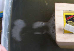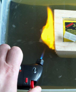 Using off board power of 1kW (100V 10A) there is a lot more action and production of hydrogen and ?oxygen or chlorine bubbles streaming from the stern, but I don't have a big enough tub of saltwater to test it for speed.  On the right is the ignition of the hydrogen bubbles with the bright yellow flame from the sodium in the seawater bubbles. Normally a hydrogen flame is almost colourless.  After a short while the electrodes wear away and the water fills with debris, presumably insoluble salts of the metal electrodes.