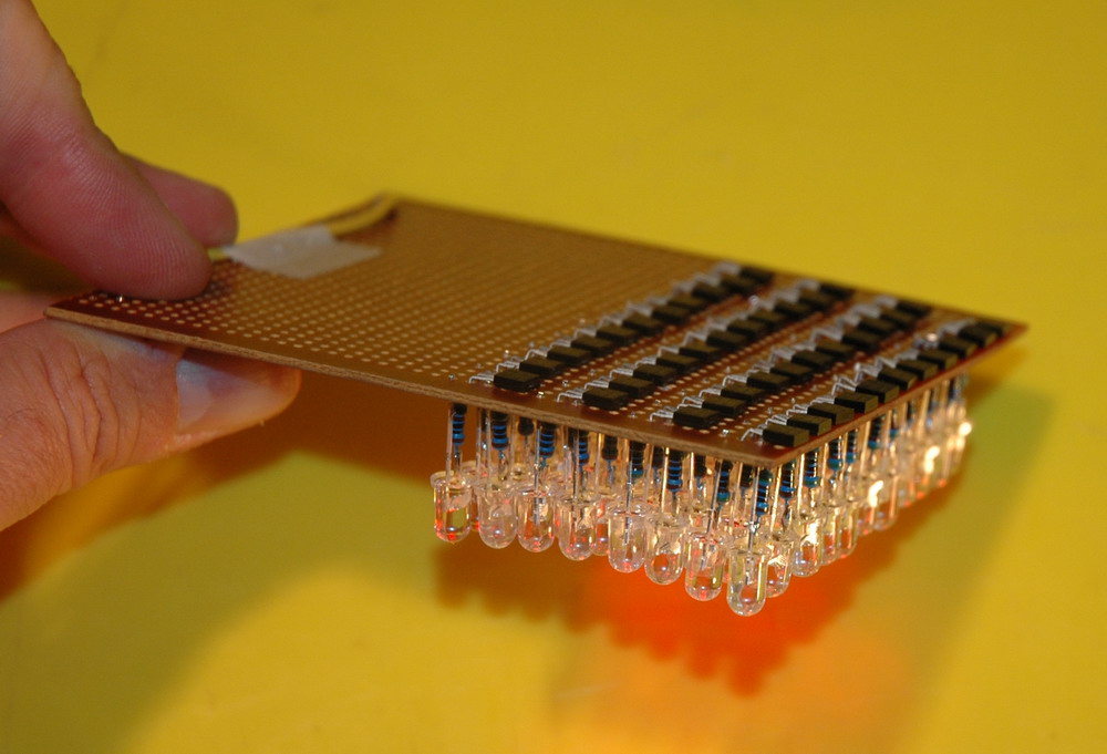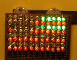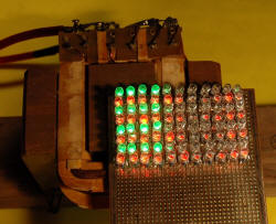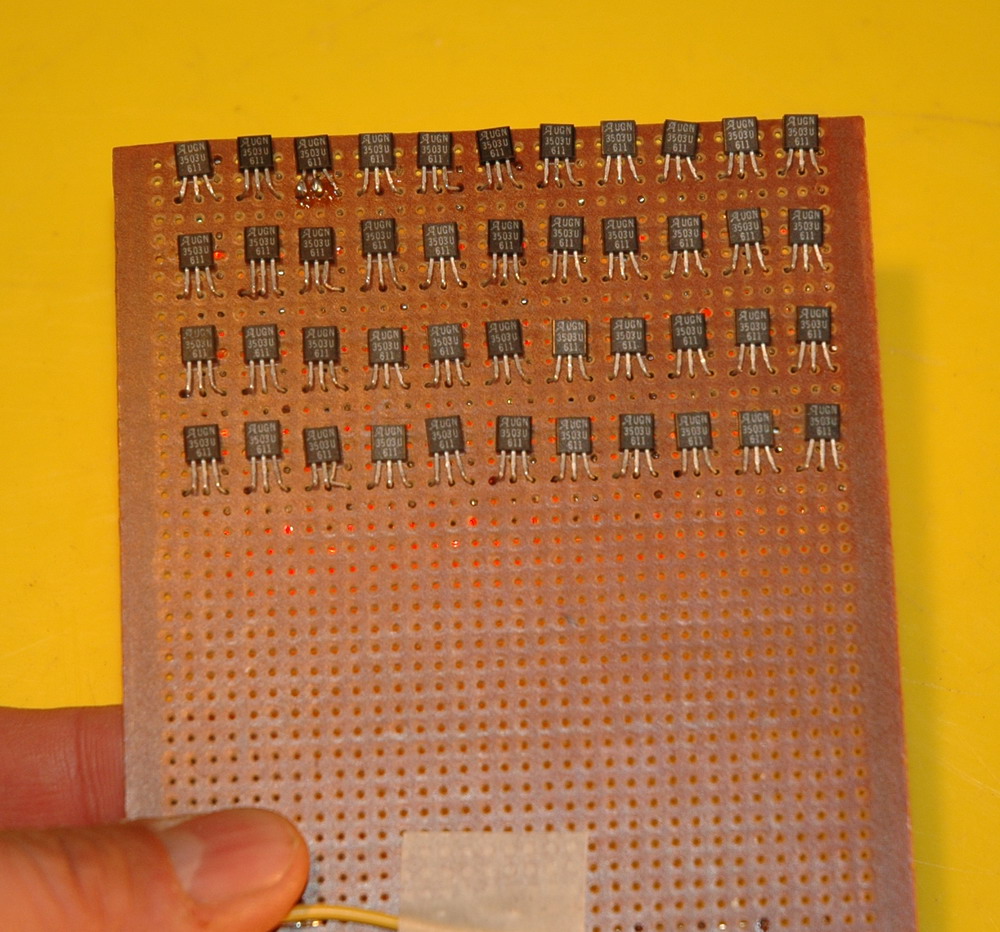 Above, left photo shows the sensor side. The right photo shows the array with a red and green LED for each Hall effect device.
