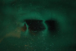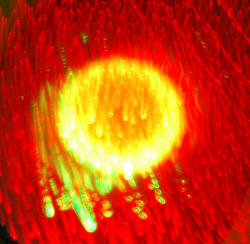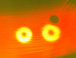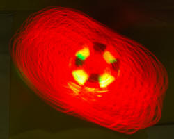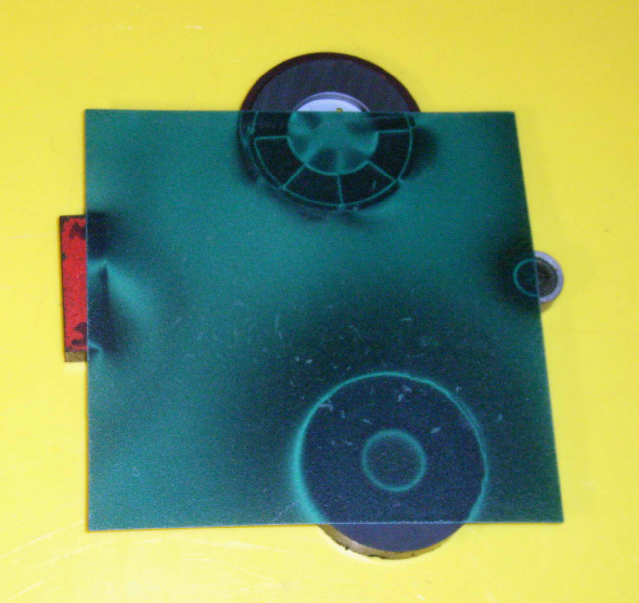 Above, left photo shows the array moving by hand in a time exposure shot of 4 seconds with magnets below the plastic sheet.  It has many passes over 3 magnets. There are two south poles of two ferrite rings and a stronger NIB magnet adjacent showing a (black?) "hole" where the NIB has been turned north up. Hand is faster than the eye here.  The  center photo shows a similar setup but demonstrating the field of a loudspeaker magnet removed from the cone and support. The  right photo shows a more complex multi sectored magnet out of a video motor.  Note that the fields do not line up properly as the red and green LED's are physically separated by 5mm or so.