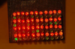 There is room on board for 88 Hall effect devices if I wish to expand. Note that this array gives a real time response with a frequency response of 23 kHz which is in the range of my can crusher. It responds to the slightest movement with intensity or colour changes and is a lot more dynamic than the still photos would indicate. Think of a colour Magnadoodle R  .  The circuit uses the output which sources current at a sufficient level to drive the red and green LED's which connect to ground with their respective 510 ohm resistors. The differing response is due to the different voltage drops with red LED's being in the 2 volt range and green LED's in the 3 volt range.